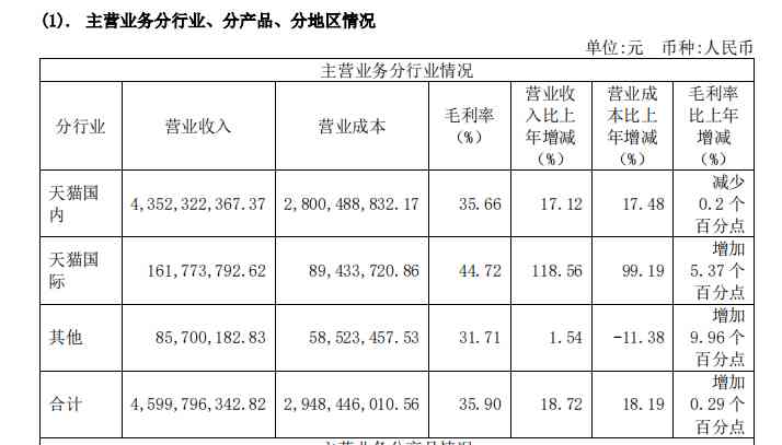 與之相對應(yīng),天貓國內(nèi)和天貓國際的營收分別達(dá)到了43.52億元、1.62億元,約占總營收的94.62%、3.51%,通過其他平臺實現(xiàn)的收入則僅有0.86億元,約占總營收的1.86%。