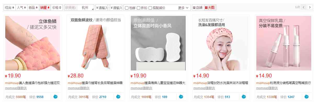 AI財經(jīng)社查詢天貓平臺發(fā)現(xiàn),以銷量排序,月銷量最高的是momoup的一款搓澡巾,促銷價19.9元,月銷量5580筆。