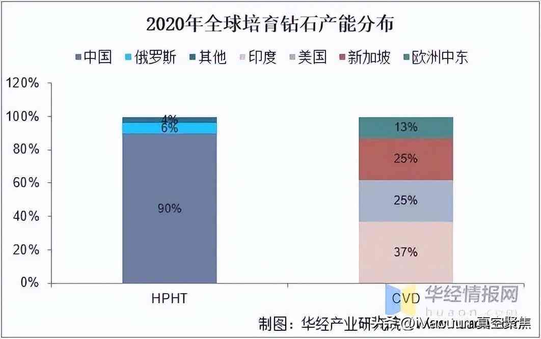 根據貝恩數據顯示,2020年全球高溫高壓技術生產的培育鉆石中,有90%來自中國,俄羅斯產能占6%,中國幾乎壟斷了全球HPHT鉆石的產能;CVD鉆石生產產能分布較均勻,印度、美國、新加坡、歐洲中東分別占37%、25%、25%、13%。