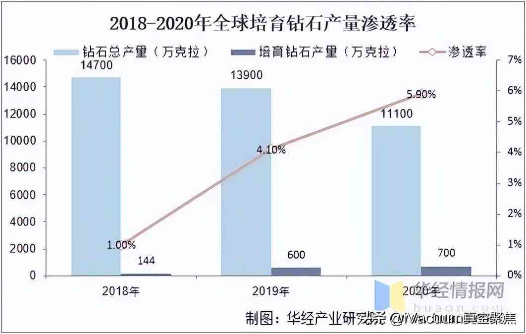 2018年全球培育鉆石產量為144萬克拉,滲透率僅為1%,由于疫情影響和天然鉆石原料緊缺等因素影響,全球鉆石總產量減少,為滿足市場鉆石消費需求,培育鉆石產量增多,滲透率穩(wěn)步上升,2019年和2020年培育鉆石產量分別為600萬克拉、700萬克拉,滲透率達到4.1%、5.9%。