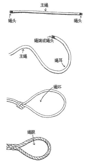 一條繩索它各個部位都有不同的名稱。繩端,就是一條繩索的兩個端頭。從端頭而到繩體的主要部份稱作主繩;彎曲的部份稱作繩耳。