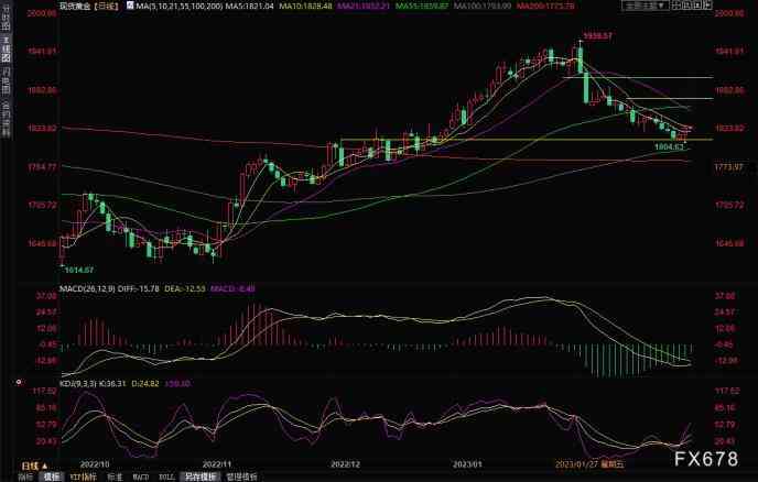 技術(shù)面來看,金價(jià)守住了1800一線支撐,KDJ相對低位結(jié)成金叉,K線低位長下影線陽性,短線見頂信號有所增強(qiáng),若能收盤于10日均線1828.5上方,則增加短線看漲信號,21日均線阻力在1852.21附近,55日均線在1860關(guān)口附近,需要收復(fù)該位置,才能扭轉(zhuǎn)金價(jià)近期跌勢。