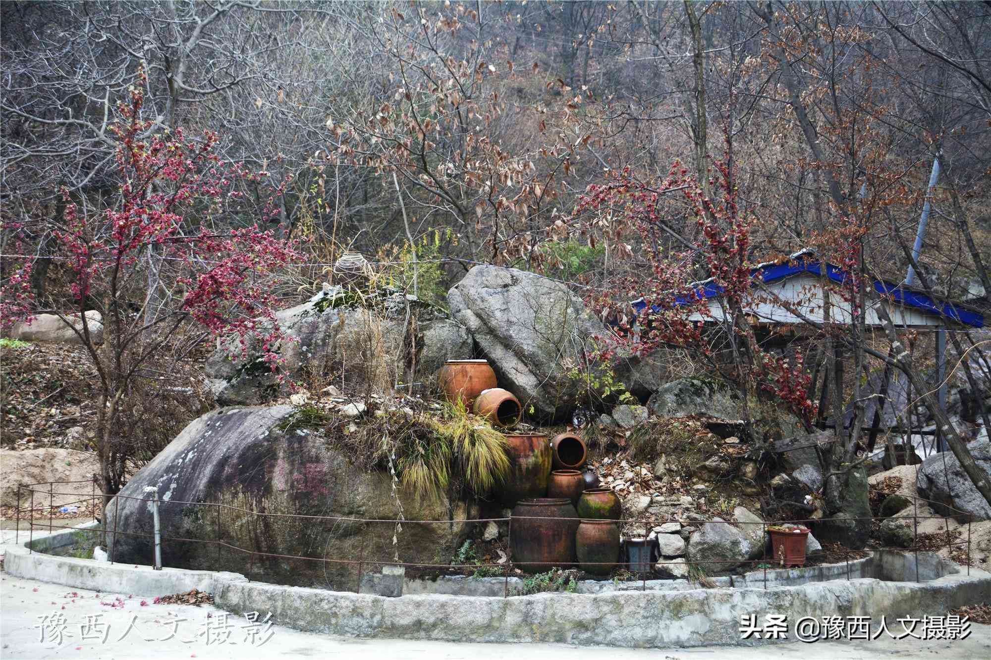 據(jù)說(shuō)伊河有三個(gè)源頭,導(dǎo)航直接搜到的是“伊河源生態(tài)風(fēng)景區(qū)”,網(wǎng)上搜集了一些基礎(chǔ)資料,開(kāi)始進(jìn)山。車行到公路盡頭,是一戶農(nóng)家賓館,用陶罐在巨石上擺出了連環(huán)流水的造型,農(nóng)家沒(méi)有人,罐子里的水也干涸了,再向前走,就是步道??戳丝磳?dǎo)航,到這條山溝的伊河源頭,還有十幾公里,當(dāng)時(shí)已經(jīng)是中午了。