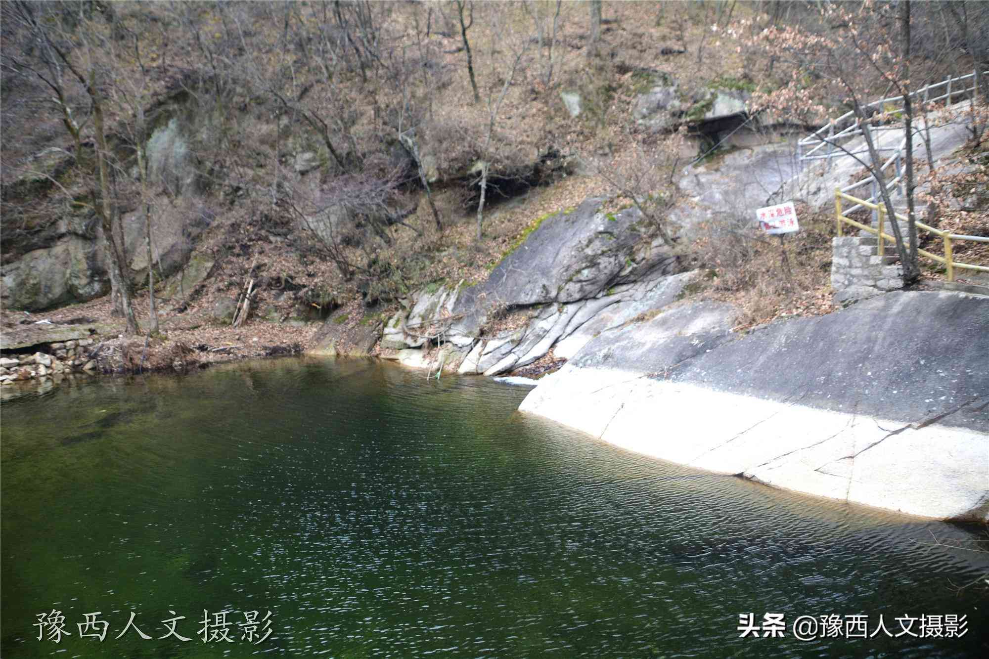 農(nóng)家賓館向里200米,是一汪碧綠的潭水,撿了塊小石頭扔進(jìn)去,看聲響,最深處2、3米應(yīng)該是有的。走過(guò)一條水泥仿石材小橋,看到的警示牌竟然寫(xiě)著“未開(kāi)發(fā)景區(qū),進(jìn)入后果自負(fù)”,而在山下,我們專門(mén)打聽(tīng)過(guò),往里走5、6里還有人家,既然有人家,又怎么是“未開(kāi)發(fā)景區(qū)”呢?