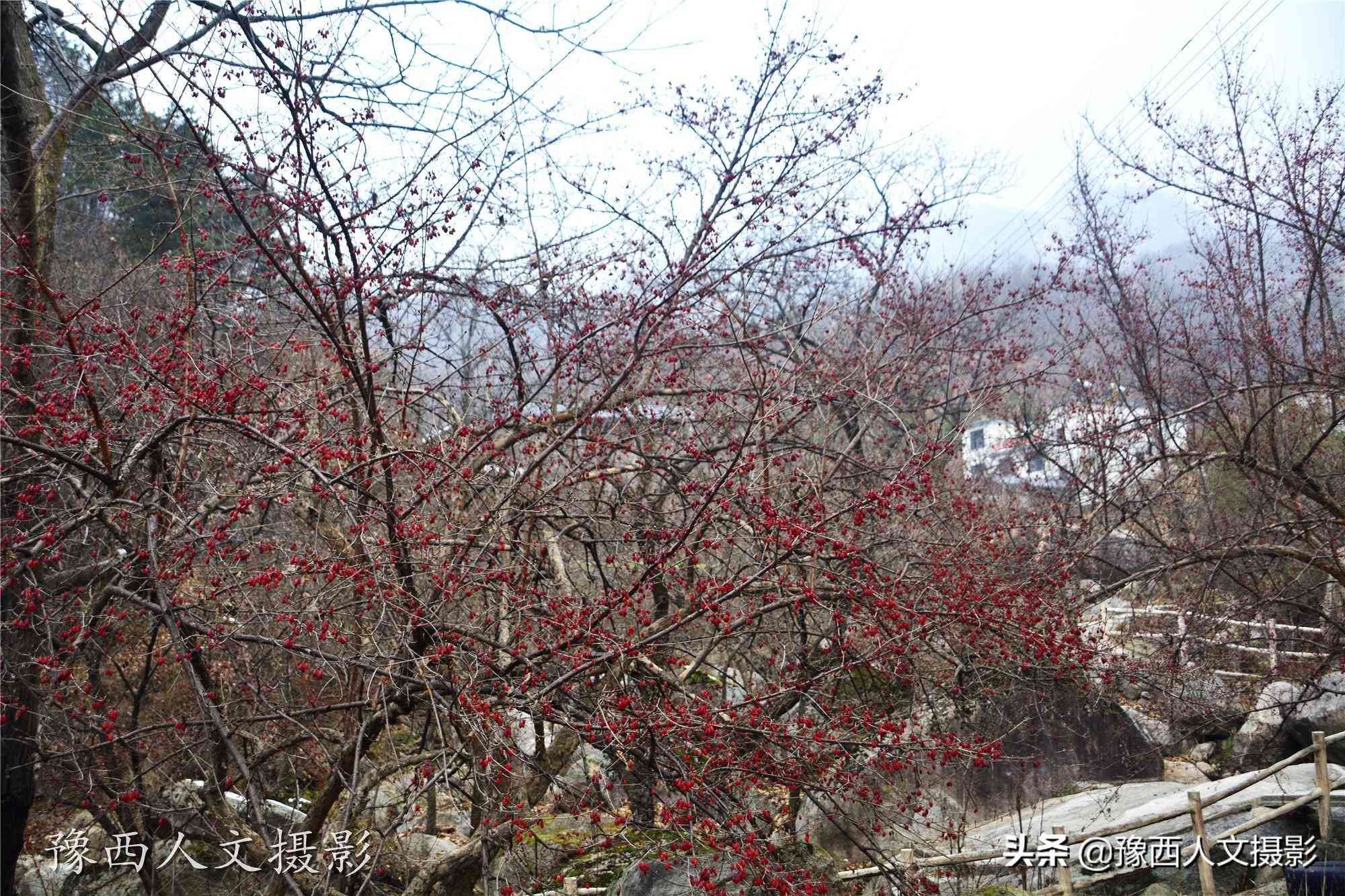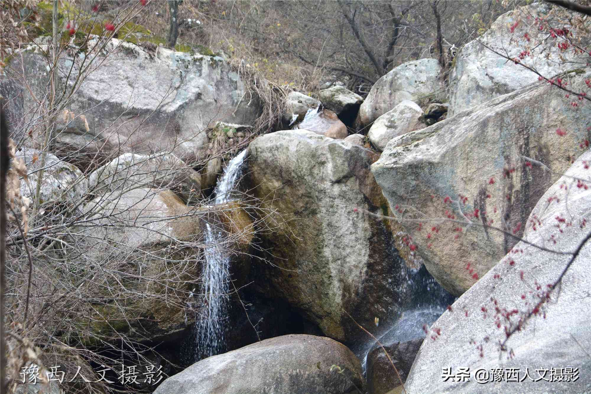 山澗里溪水不大,卻有淙淙響聲,石階兩旁,還有很多沒(méi)來(lái)得及采摘的山茱萸,給這兒冬日的蕭條增添了一分顏色。欒川山區(qū)種植山茱萸的比較多,像路邊這幾棵樹(shù),已經(jīng)有燴面碗口粗細(xì)了,應(yīng)該是30來(lái)年前栽下的。拇指大的果子壓垂了樹(shù)枝,卻不知道為什么還沒(méi)有采摘,半個(gè)月前在宜陽(yáng)花果山,那里的山茱萸早就已經(jīng)摘完了。