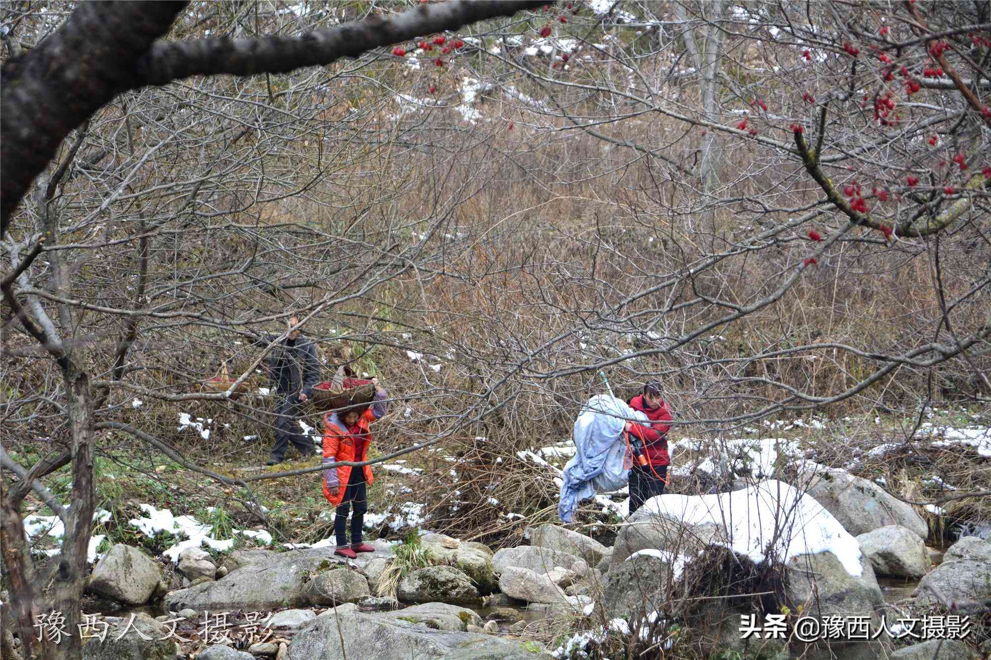 告別大叔,繼續(xù)前行,山里石頭上的余雪多了起來(lái),有些干枯的老樹(shù)上面,也存有積雪。青青的苔蘚、紅紅的茱萸,是這山谷里活著的顏色。