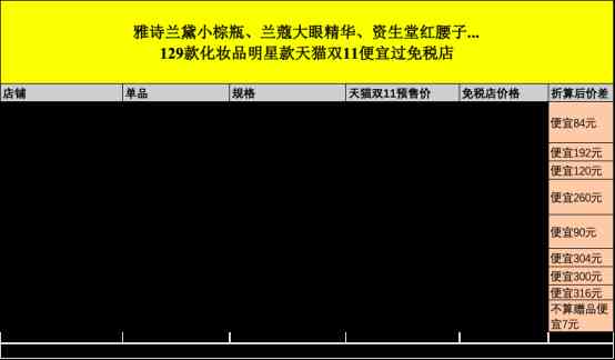 記者發(fā)現(xiàn),這份調(diào)研報告幾乎涵蓋了所有人們出國旅行最愛代購的大牌明星化妝品,包括了蘭蔻的粉水和發(fā)光眼霜、赫蓮娜的綠寶瓶、雅頓的金膠、雅詩蘭黛的小棕瓶和嬌蘭的黃金復(fù)原蜜等,調(diào)研中清楚標(biāo)明了專柜、日上免稅店和天貓雙11的預(yù)售價。