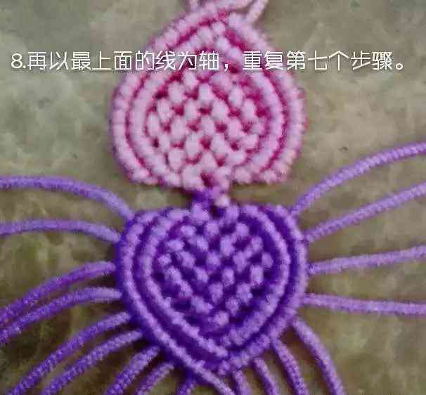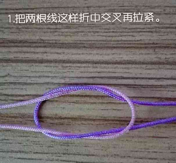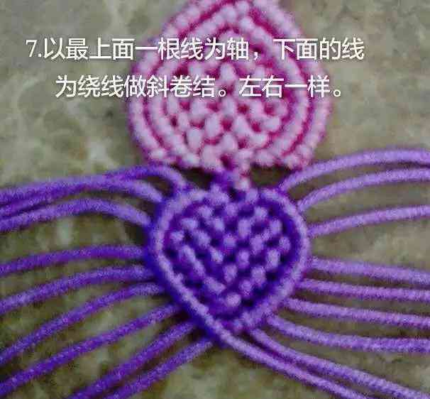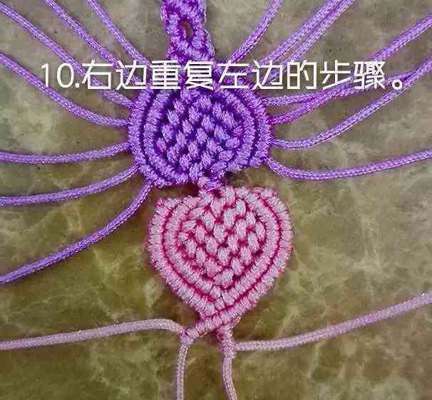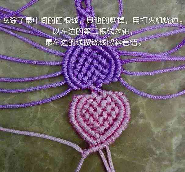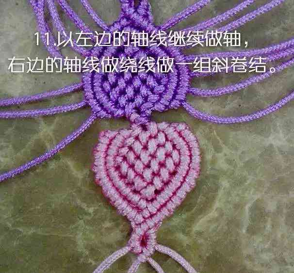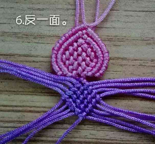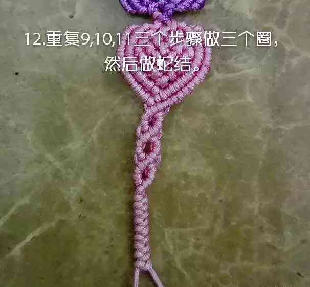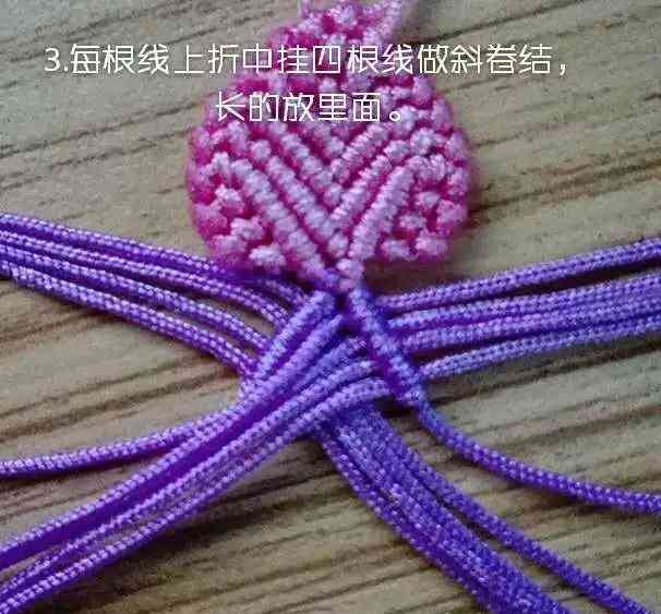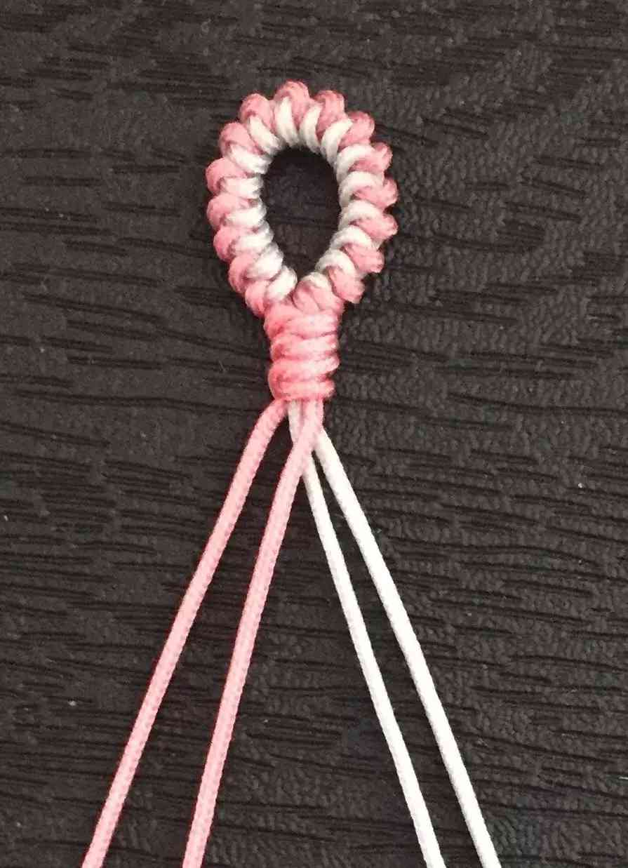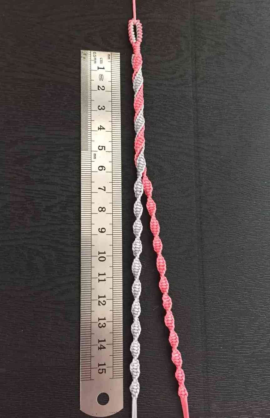 2、取90厘米長的粉灰2根線做中心軸,對折在最中間做“蛇結(jié)”15個。