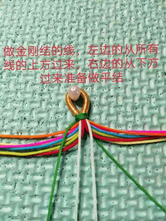 7、旋轉(zhuǎn)完了做“金剛結(jié)”3個,再做一個“紐扣結(jié)”,手鏈大功告成。