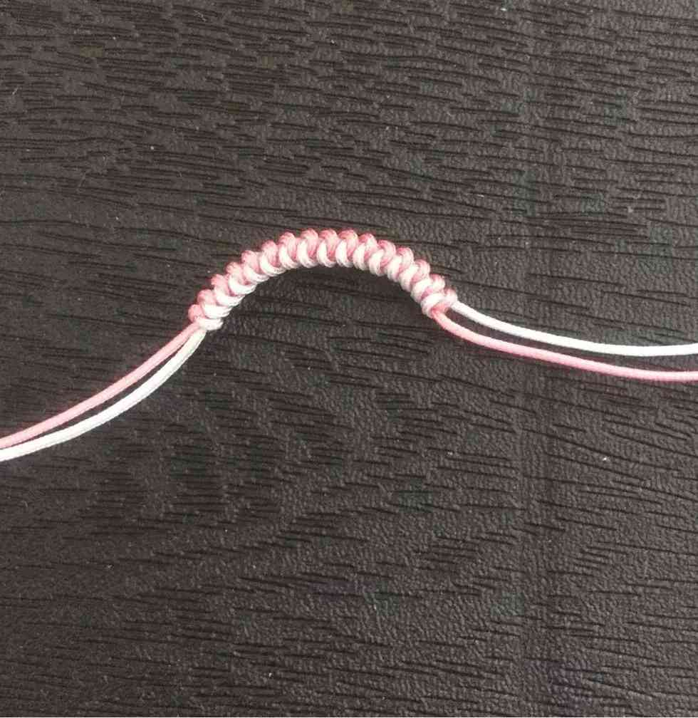 6、2條“單平結(jié)”做好了,注意上圖其中一條單平結(jié)要比另一條長0.5厘米左右,為什么這樣做?因為接下來以一條短點的為中心軸,另一條長點的繞著中心軸旋轉(zhuǎn),這樣結(jié)尾處才會對齊平整。