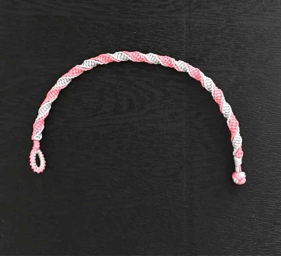 制作過程1、準備71號玉線4根,2粉,2灰,1根粉色90厘米長,1根粉色190厘米長,1根灰色90厘米長,1根灰色190厘米長。