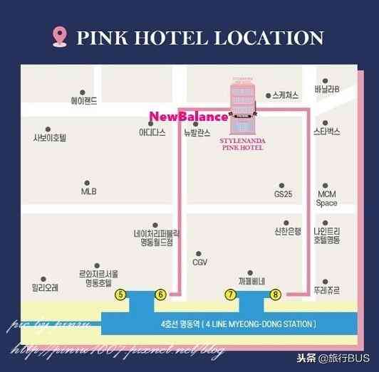 明洞Stylenanda Pink Hotel怎么去?地鐵站六號出口上來后朝著主街直走,轉(zhuǎn)角處會看到一間超大的new balance,從這里右轉(zhuǎn)即可看到。