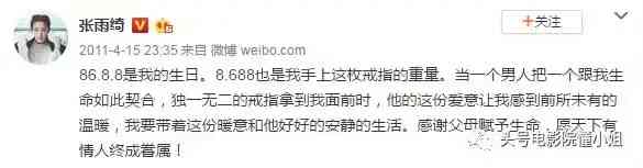 早在2011年,張雨綺就曾經(jīng)在網(wǎng)上公開(kāi)曬出一顆巨型鉆戒,寫(xiě)道“我回來(lái)啦!我的8688!”一度引發(fā)熱議。那枚鴿子蛋就是當(dāng)時(shí)導(dǎo)演王全安送給張雨綺的“愛(ài)的鉆戒”,8.688克拉,正好與張雨綺的生日1986年8月8月一致。
