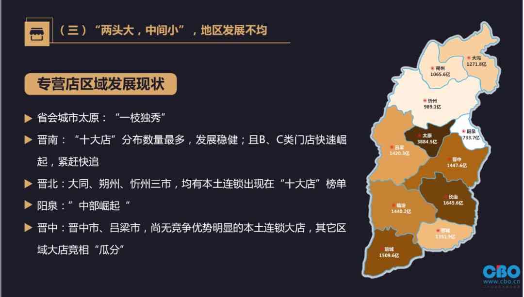 反而像中部地區(qū)的晉中、呂梁兩個市,地處省會太原輻射范圍,經(jīng)濟、人口都處于山西中上游水平,卻沒有在本土培育出一家具有明顯競爭優(yōu)勢的連鎖大店,而是出現(xiàn)晉北、晉南其它地區(qū)專營店老板競相前去開店,瓜分剩余市場的“怪相”。