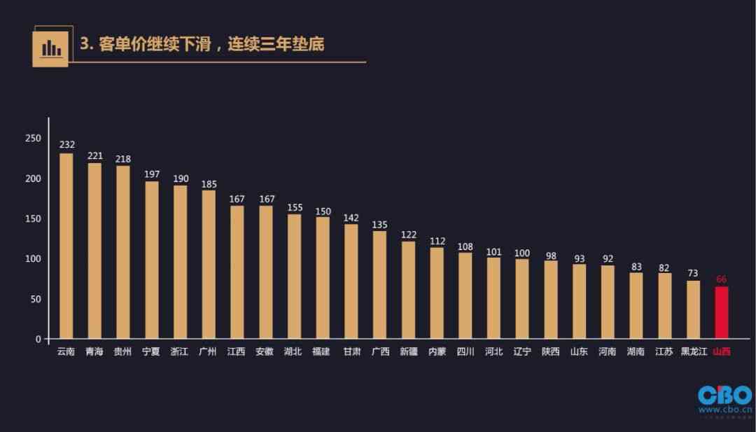 經(jīng)濟水平相對滯后,消費者實際購買力有限,使得山西專營店在客單價上一直處于劣勢。在24省排名中,山西客單價進一步下滑墊底,與其它省份的差距繼續(xù)拉大。如何挖掘顧客需求,成了不少門店需要認(rèn)真下功夫的事情。