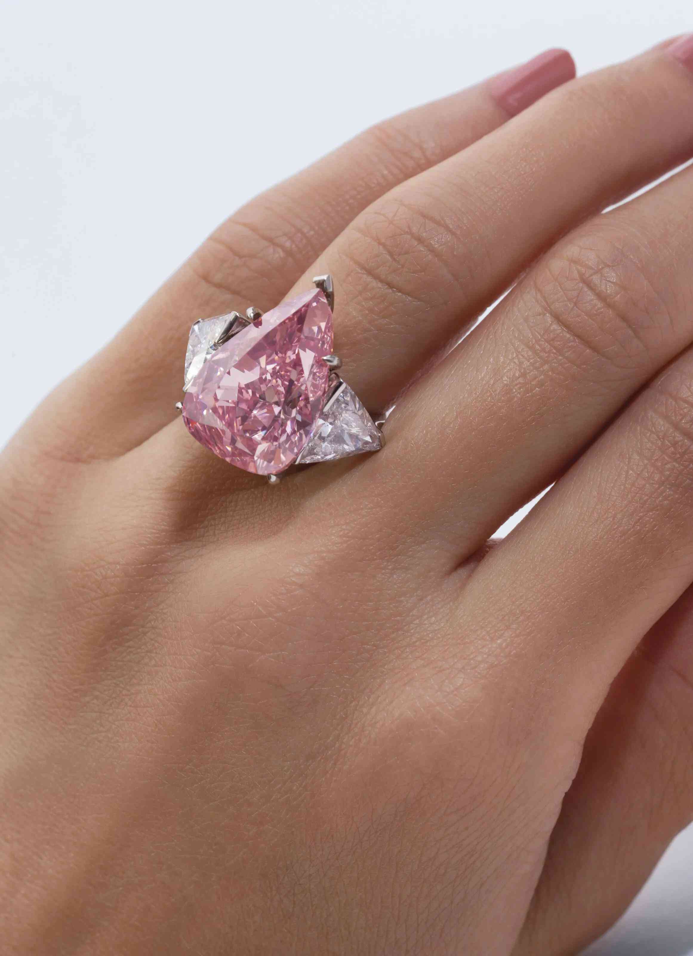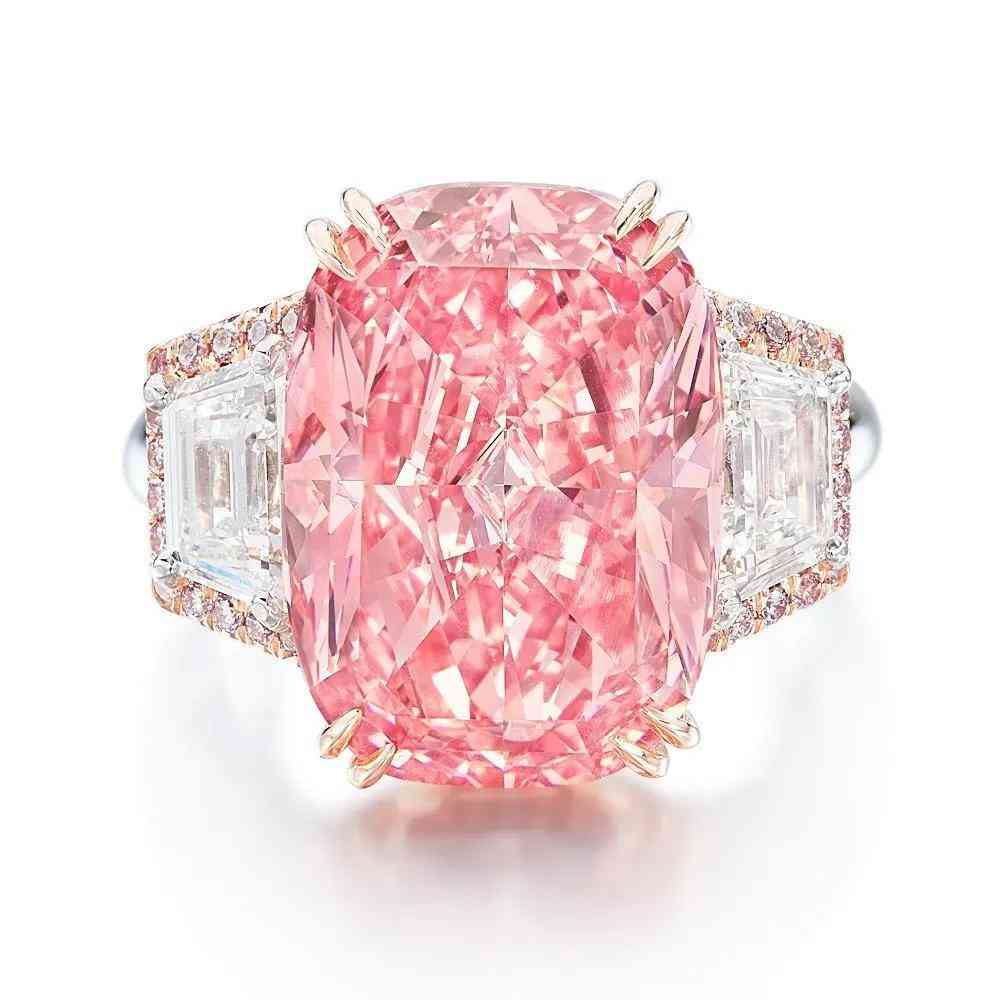 “The Vivid Pink”鑲嵌在英國(guó)珠寶商格拉夫(Graff)設(shè)計(jì)的鉑金和18K玫瑰金戒指上,兩側(cè)飾以盾形鉆石。這顆粉紅鉆在香港拍賣時(shí),以超過(guò)最低估價(jià)兩倍的價(jià)格成交,刷新了當(dāng)時(shí)粉紅鉆的單克拉價(jià)格紀(jì)錄(2,155,332美元/克拉),此紀(jì)錄直到2017年才被佳士得拍出的另一枚絕色粉紅鉆“The Pink Promise”打破。