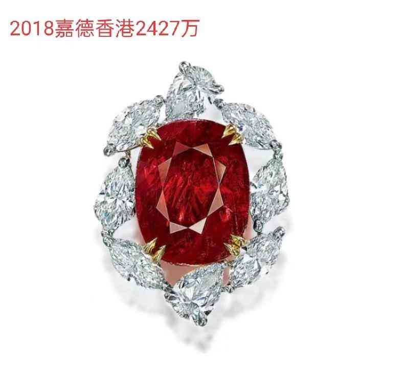 榮居第九位的是2018年中國嘉德香港春季拍賣會上成交的一枚10.02克拉天然緬甸抹谷鴿血紅紅寶石配鉆戒指,成交價為2427萬元。