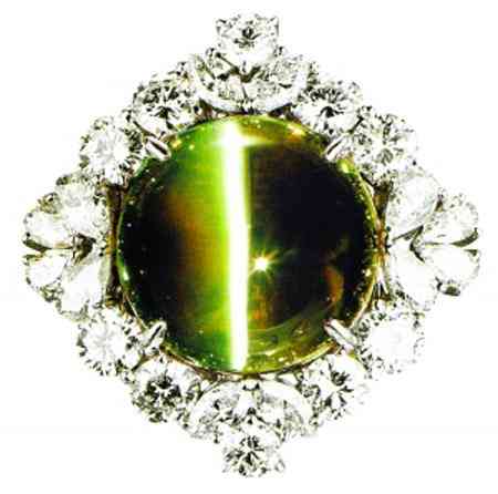 金綠貓眼,眼線正、質(zhì)地純,價值并不遜于鉆石,更重要的是,其獨有的潤澤和眼線形成的流光溢彩,極具裝飾效果,與高雅裝束十分相配。金綠貓眼中,有蜜黃、葵花黃、蘋果綠、灰、酒黃等顏色,雖然每種均有極品,但還是蜜黃色更適合中國人的膚色。