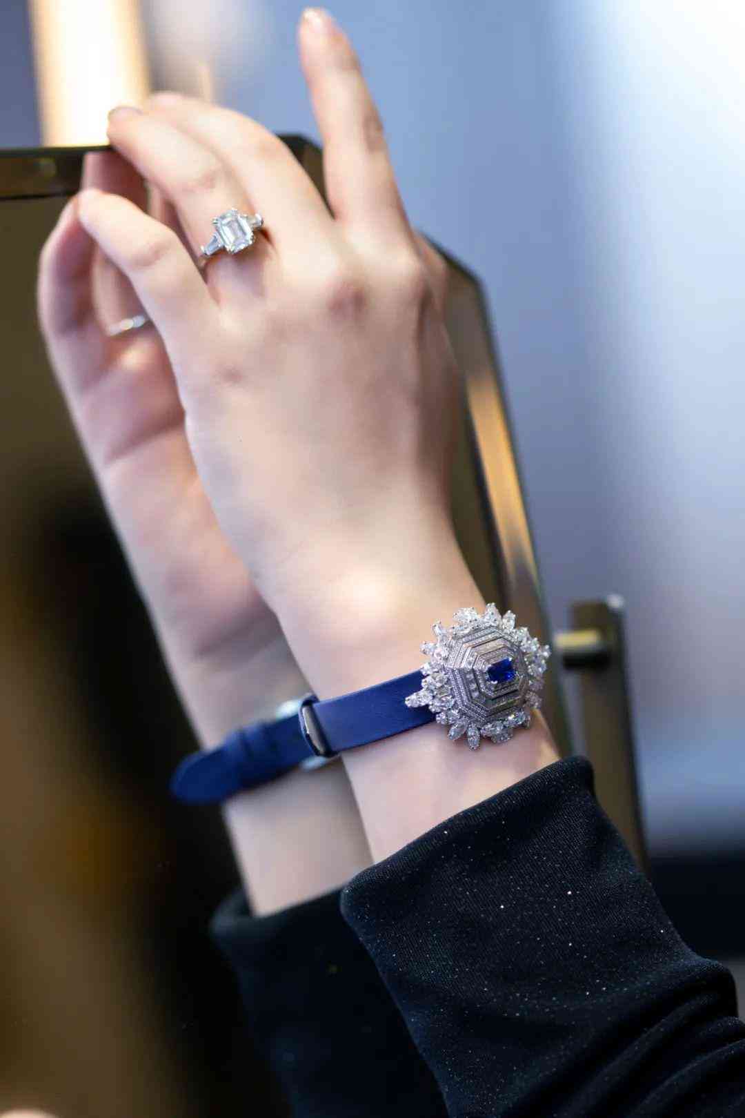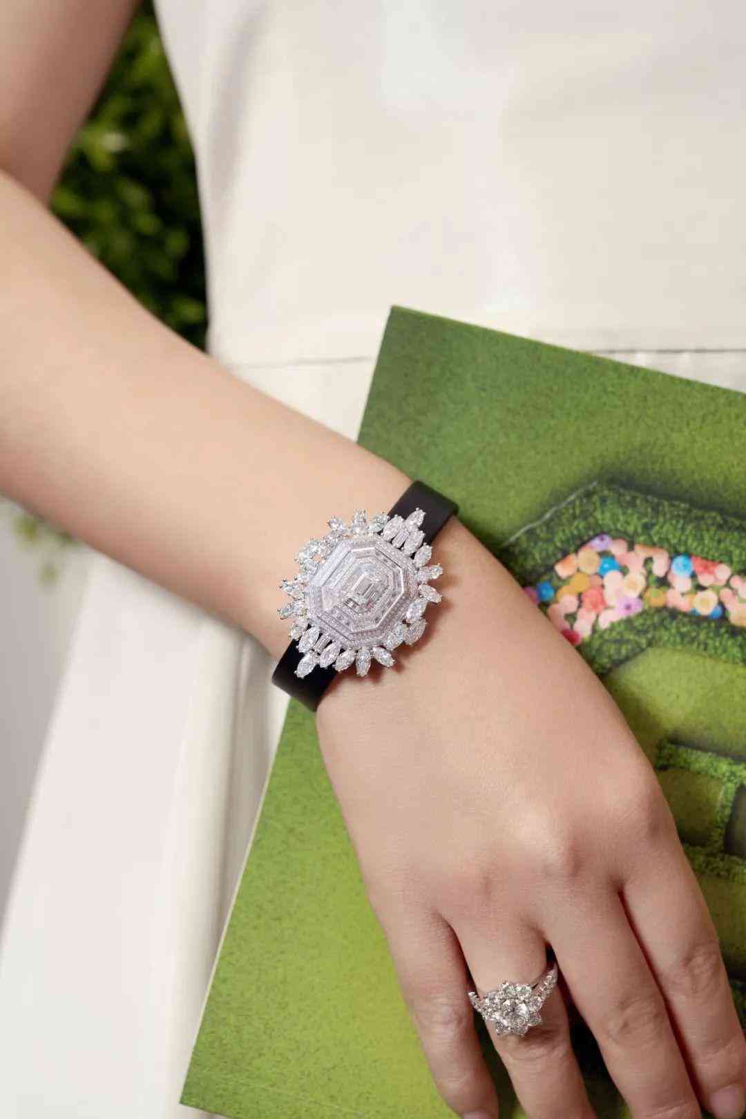 腕表的外觀堪稱獨一無二,由許多長方形臺面和祖母綠型的幾何造型組成,打造出“鏡廳”一般的反射效果。整個腕表上鑲嵌的圓形、長形、馬眼型、祖母綠型切工鉆石,總重近10克拉,舉手投足間流光溢彩、火光四射,讓人移不開眼睛。