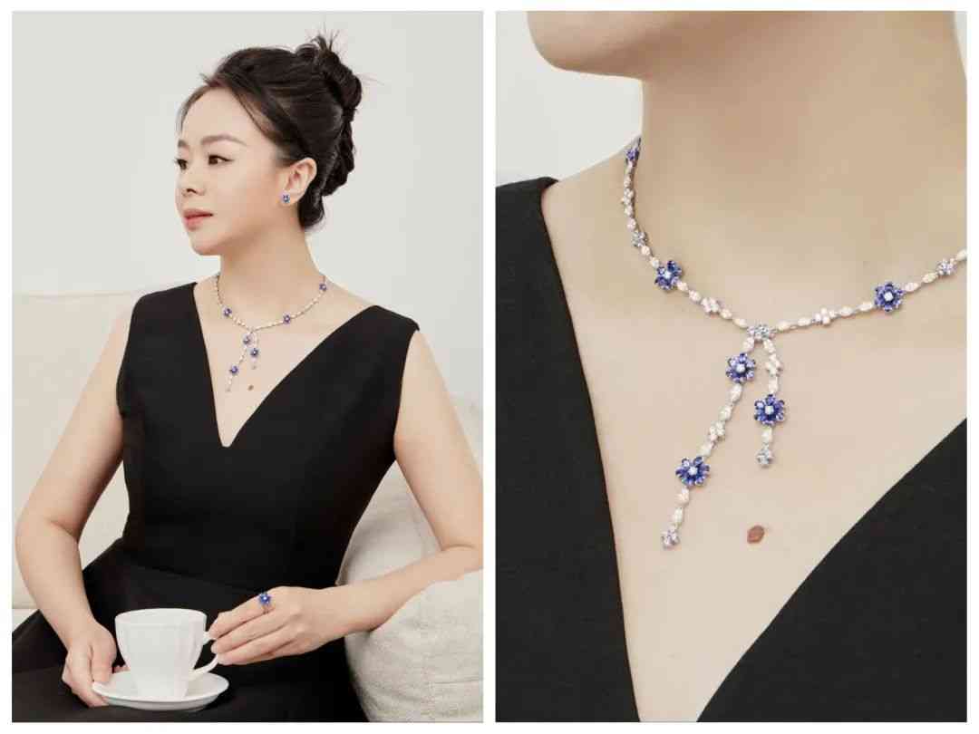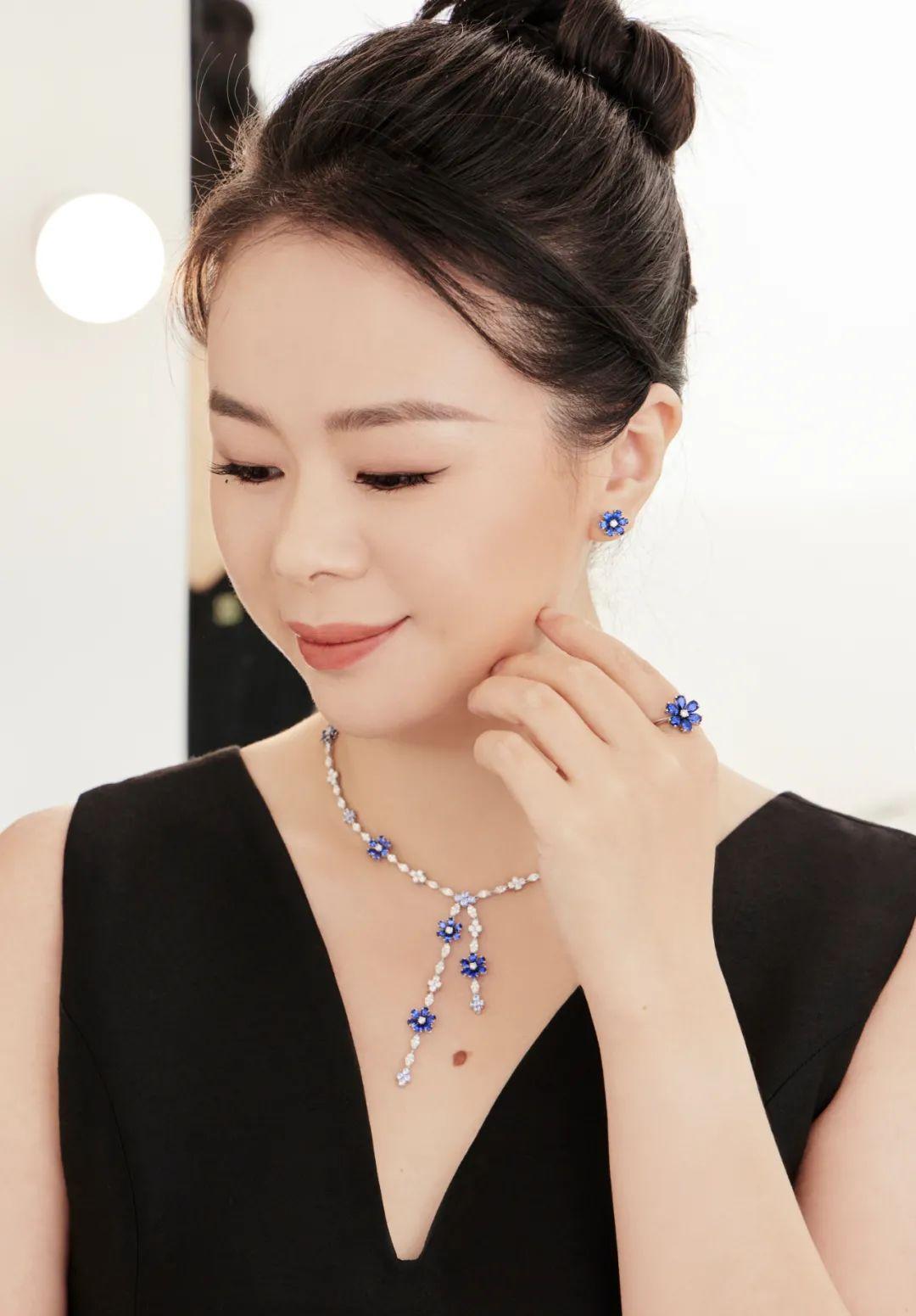 項鏈鑲嵌著78顆水滴形和圓形明亮式切工,總重約9.37克拉的藍寶石,以及99顆欖尖形和圓形明亮式切工,總重約8.61克拉的鉆石,足夠華麗的同時又纖巧靈動,舉手投足間不經意流露女人味。