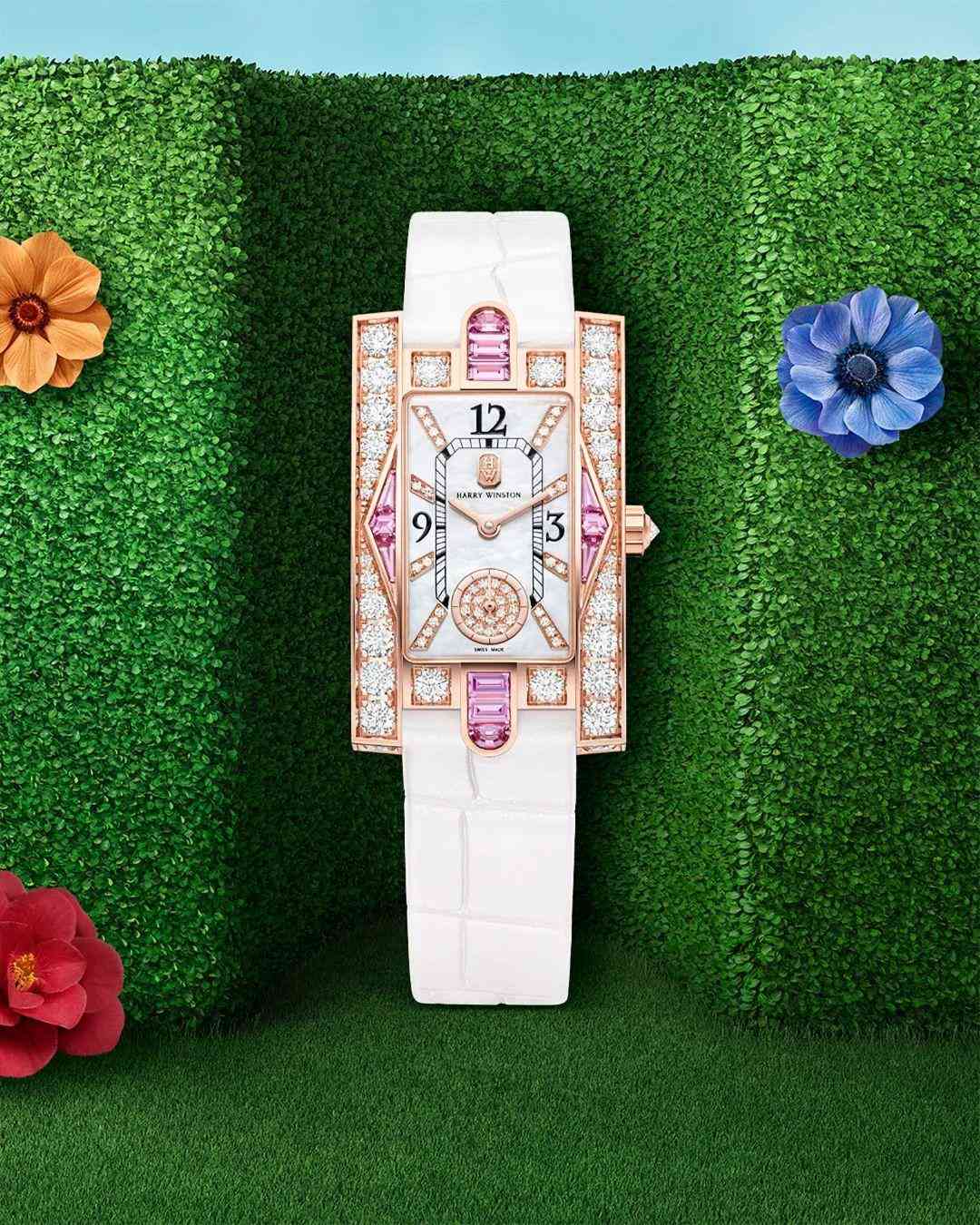 18K玫瑰金方形表殼十分獨特,鑲嵌璀璨美鉆和粉色藍寶石,致敬了裝飾藝術時期,還融入品牌紐約旗艦店的標志性元素,很有HW經典基因。