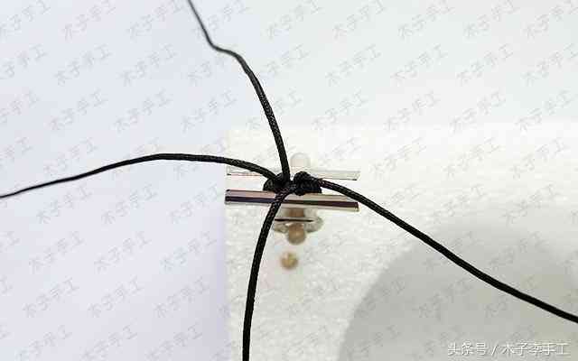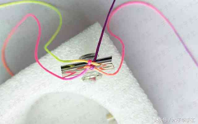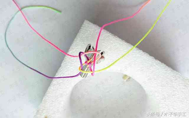 2、用夾子固定蛇結,將線分布到不同的四個方向,開始編玉米結