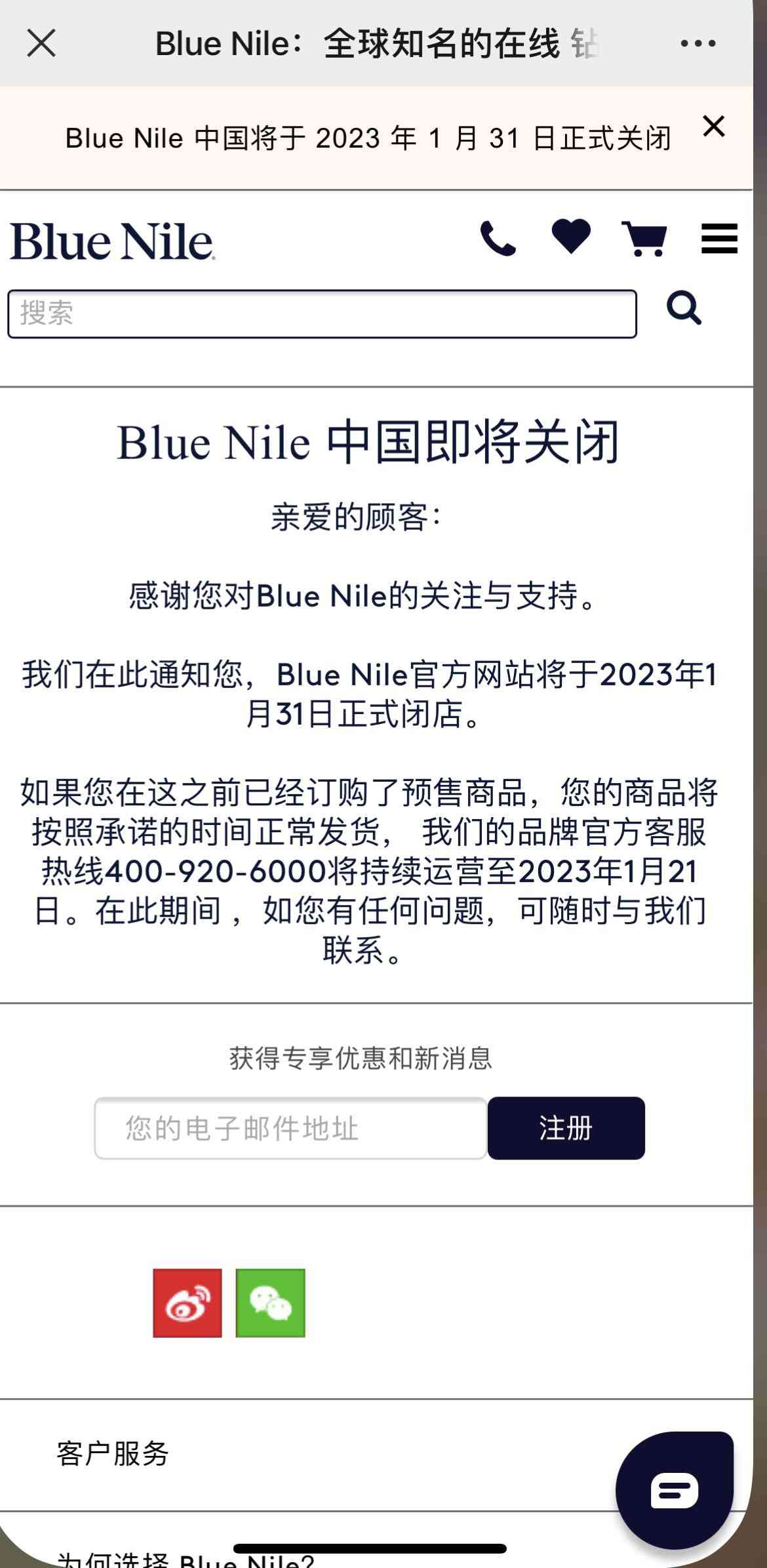 而Blue Nile中國內(nèi)地官網(wǎng)將在2023年1月31日正式關(guān)閉。界面新聞在Blue Nile中國香港官網(wǎng)未看到閉店信息。
