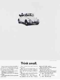 “think small”的廣告,直截了當(dāng)?shù)靥嵝讶藗冊囍鴵Q角度思考;接著正文描述:這車真的很小,外觀也沒什么新奇,以至于輕易就被忽視掉。就連真正駕駛它的人,也沒注意過它確實很省油,還不需防凍劑;而當(dāng)你擠停車場、換保險金、支付維修費、以舊換新時,想想還是小一點的好。