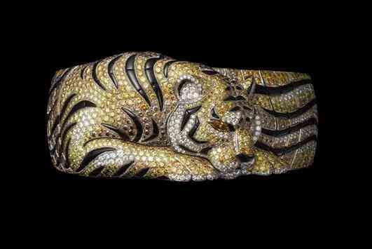 卡地亞高級(jí)珠寶手鐲,白K金,棕色、橙色與黃色鉆石,縞瑪瑙,明亮式切割鉆石。