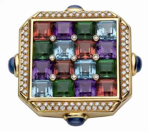 黃金胸針,鑲嵌海藍(lán)寶石,紫水晶,綠色及綠色碧璽,藍(lán)寶石與鉆石