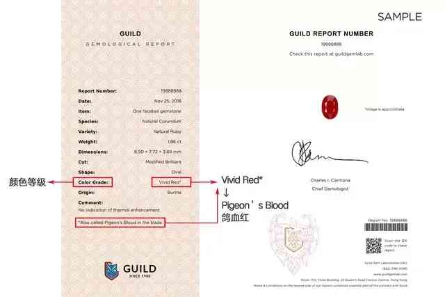 ·在GUILD顏色分級和產(chǎn)地證書中,鴿血紅(Pigeon’s Blood)以【Vivid Red*】表示,并在左下角注釋:*Also called Pigeon’s Blood in the trade,譯為:*在寶石商貿(mào)中也稱為鴿血紅(圖3)。