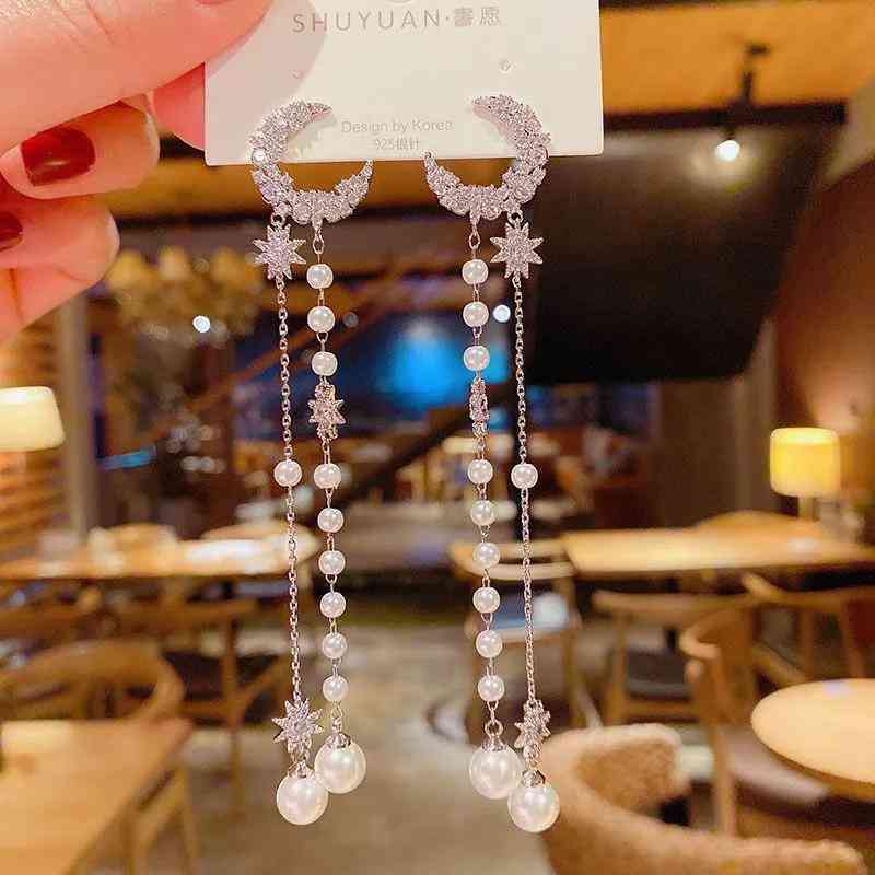東大門夸張時(shí)尚星月長流蘇珍珠耳環(huán)韓國氣質(zhì)網(wǎng)紅個(gè)性百搭銀針耳飾