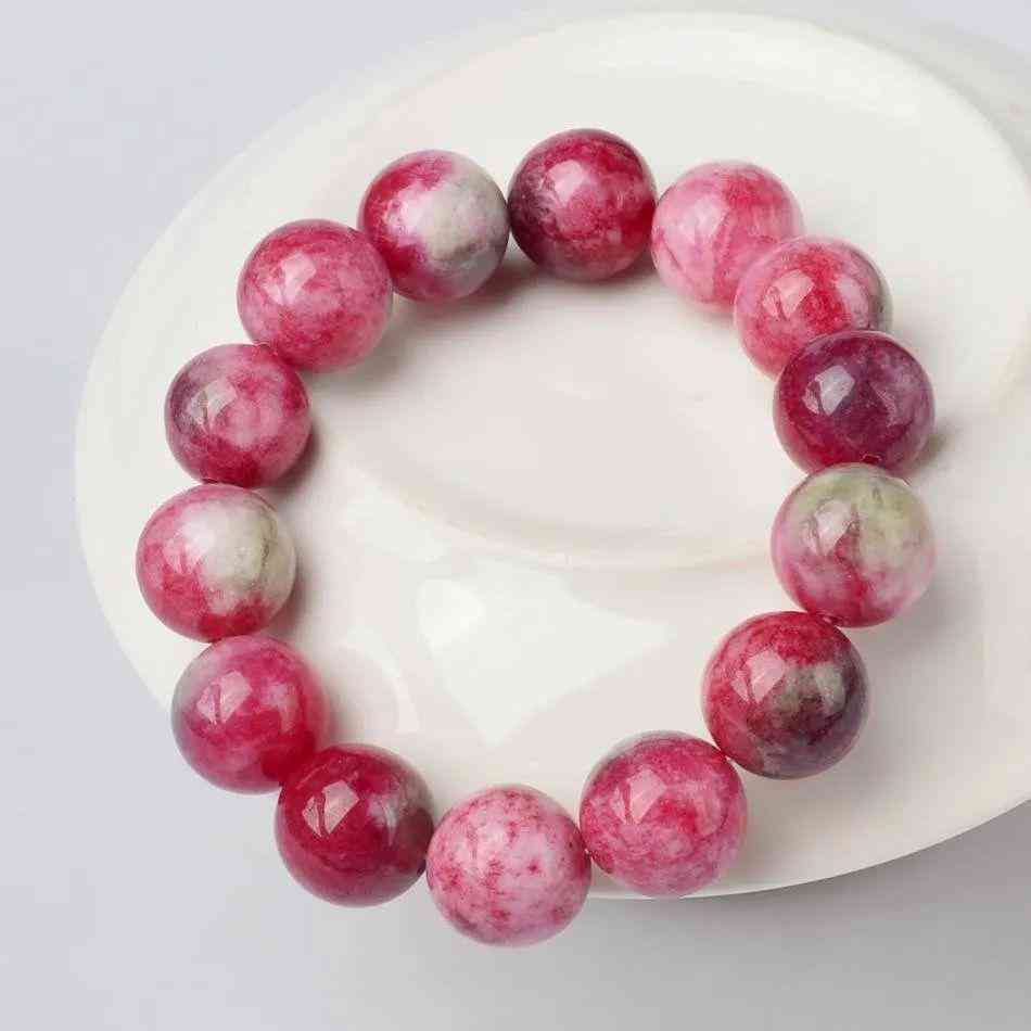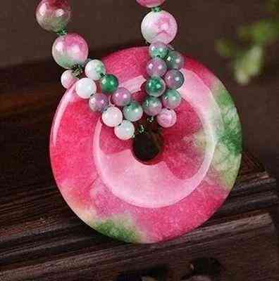 桃花玉學(xué)名薔薇輝石,因質(zhì)地、硬度同翡翠相似又被成為粉色的翠。桃花玉的石質(zhì)紅膩,色彩斑斕,晶瑩剔透。桃花玉看起來就像嬌艷的桃花一樣惹人喜愛,開采后的切面會出現(xiàn)綠色,恰似桃花的綠葉。五彩繽紛,絢麗多彩。