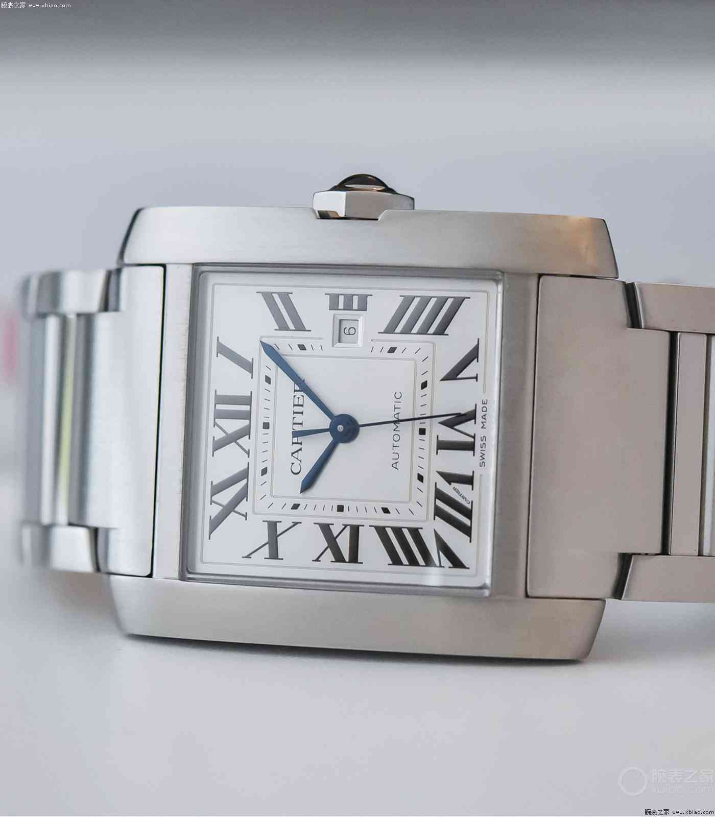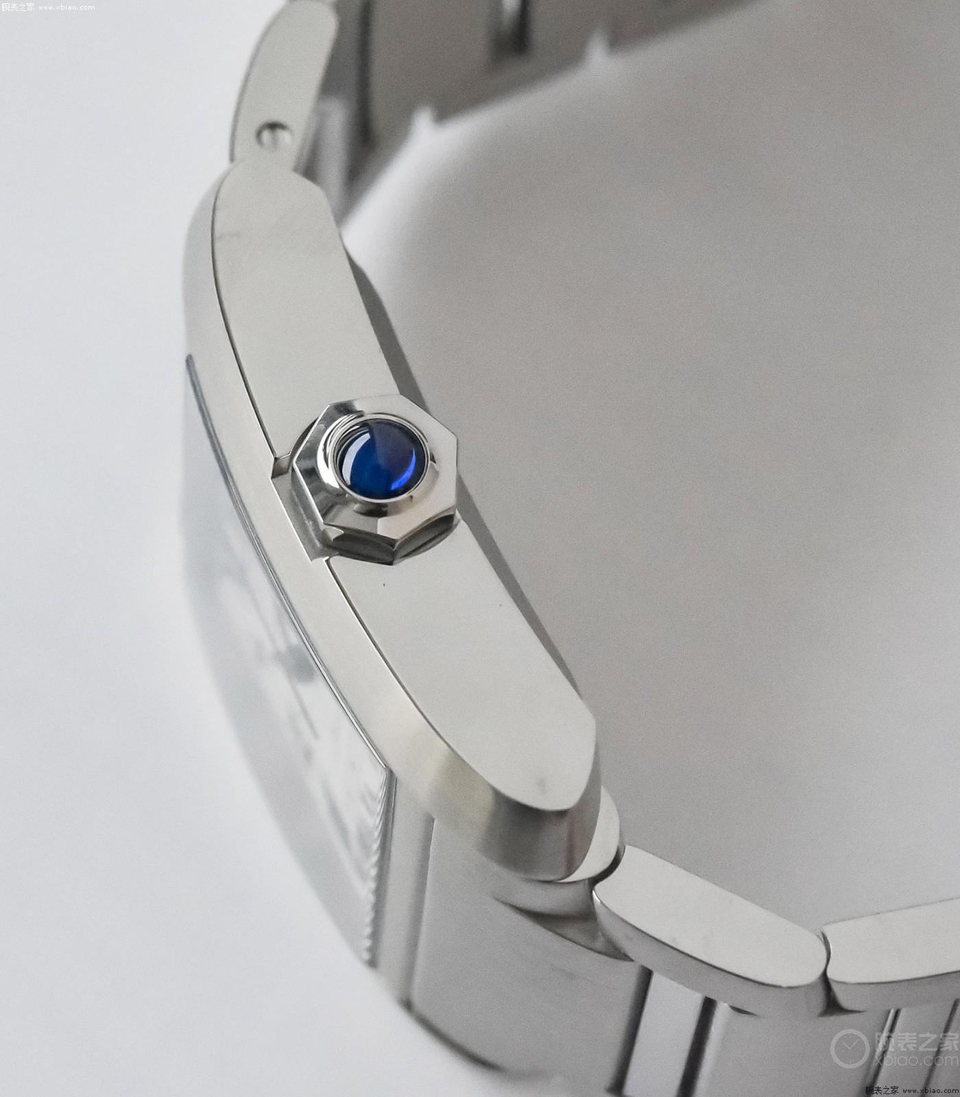 咱們這里主要看男表。在卡地亞的尺寸中,大號和加大號,是男表。大號一般對應(yīng)36、37毫米;加大號對應(yīng)40毫米以上。新一代法國坦克的男款,只有鋼殼版本,并且也只有男款是機械機芯。法國坦克男款,大三針,有日歷(卡地亞的石英表,都是兩針表)。指針都進行了烤藍,在盤面中央,有方形刻度內(nèi)圈。八角形表冠上,有卡地亞標(biāo)志性的藍色尖晶石。識別度非常高。男款10.1毫米的厚度,也比較薄,正裝休閑通吃。