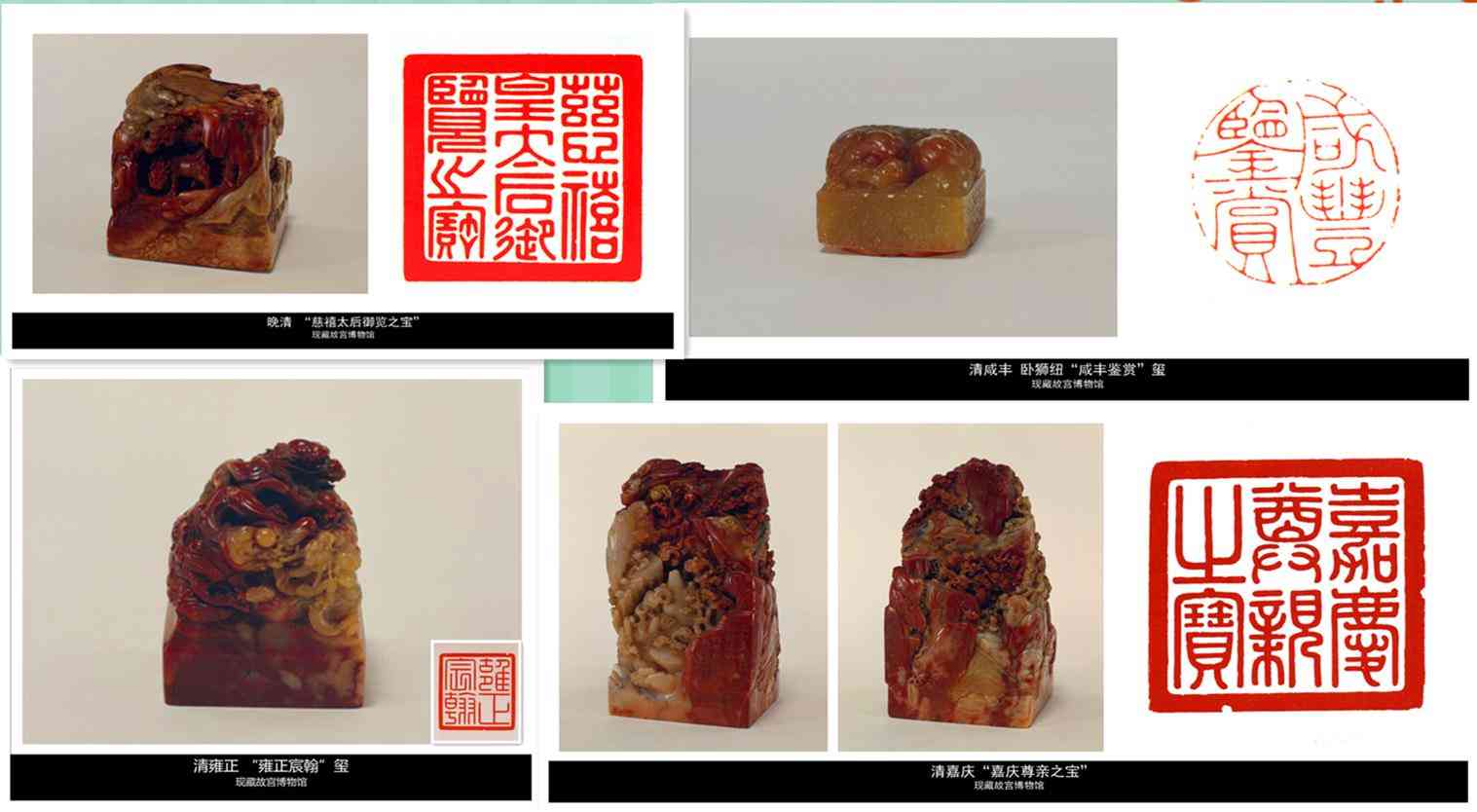 康熙、雍正、乾隆各朝,喜愛壽山石之風(fēng)更盛,選石也更加講究名貴的芙蓉石自然得到清朝皇族的寵愛??滴醯塾n“朗吟閣寶“即為白芙蓉石所制;雍正帝用的“壺中元”、“和碩怡親王寶”、“膺天慶”印璽皆為芙蓉石章;乾隆皇帝一生所用的壽山石印章,竟多達(dá)百余枚,其中有不少是芙蓉石章。清咸豐十一年,咸豐皇帝規(guī)定他御用的“御賞”田黃石印章與“同道堂”芙蓉石印章,作為他“殯天”之后下達(dá)諭的憑信,“御賞”章作為“印起”,“同道堂”章作為“印訖”,必須同時(shí)加蓋方為有效?;实蹖ⅰ坝p”章賜太子載淳,“同道堂”章交由皇太后保管。西太后慈禧便發(fā)動(dòng)了政變,或殺或貶了幾位顧命大臣,將政權(quán)連同兩枚印章都掌握到自己手中,改年號(hào)為“同治”,垂廉聽政。這個(gè)歷史上有名的“祺祥政變”御用的故事,說明了壽山石不僅貴為御用,不參與了一段重大的歷史事件。芙蓉石雍容華貴,細(xì)膩脂潤(rùn),而且清朝皇帝將田黃石章與芙蓉石章一起作為下達(dá)詔諭的憑信,芙蓉石順理成為“石后”。