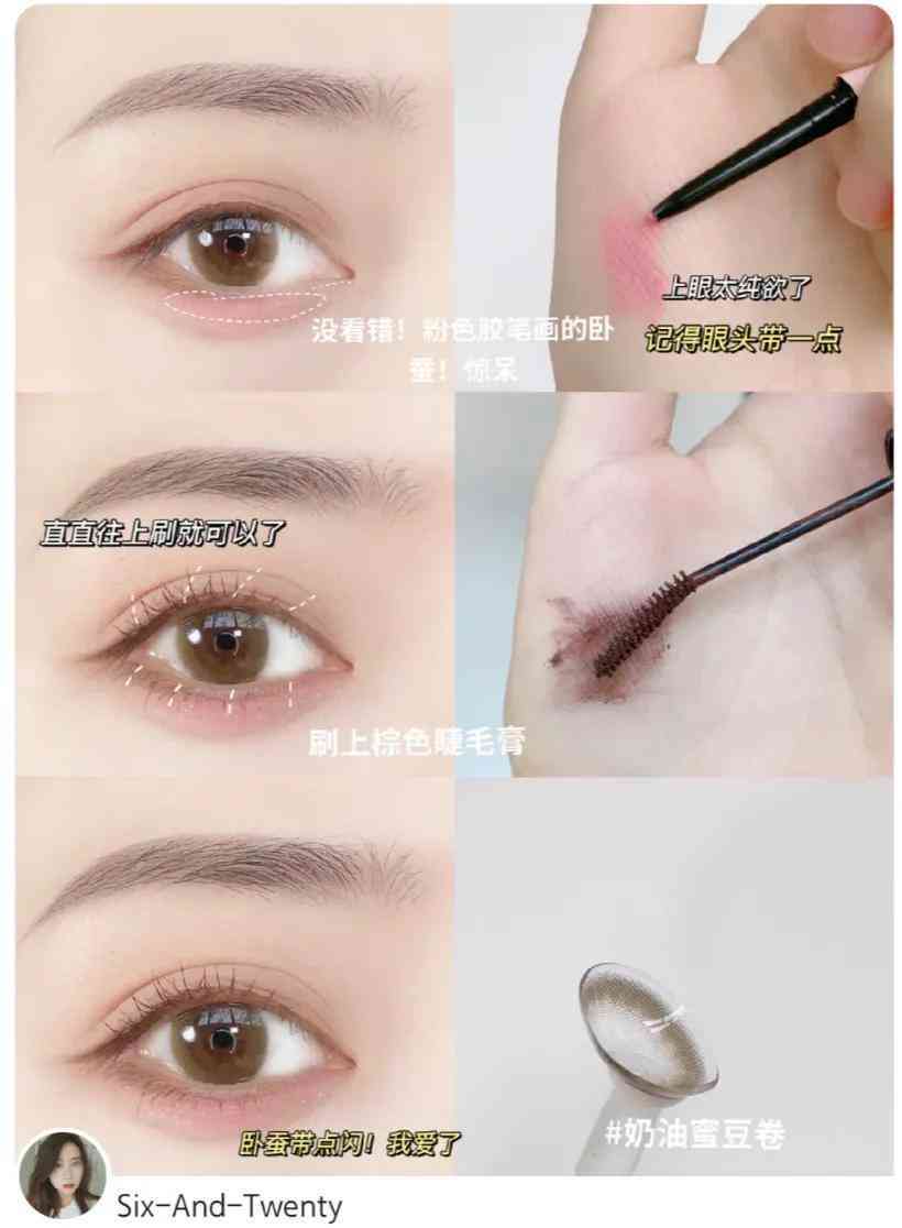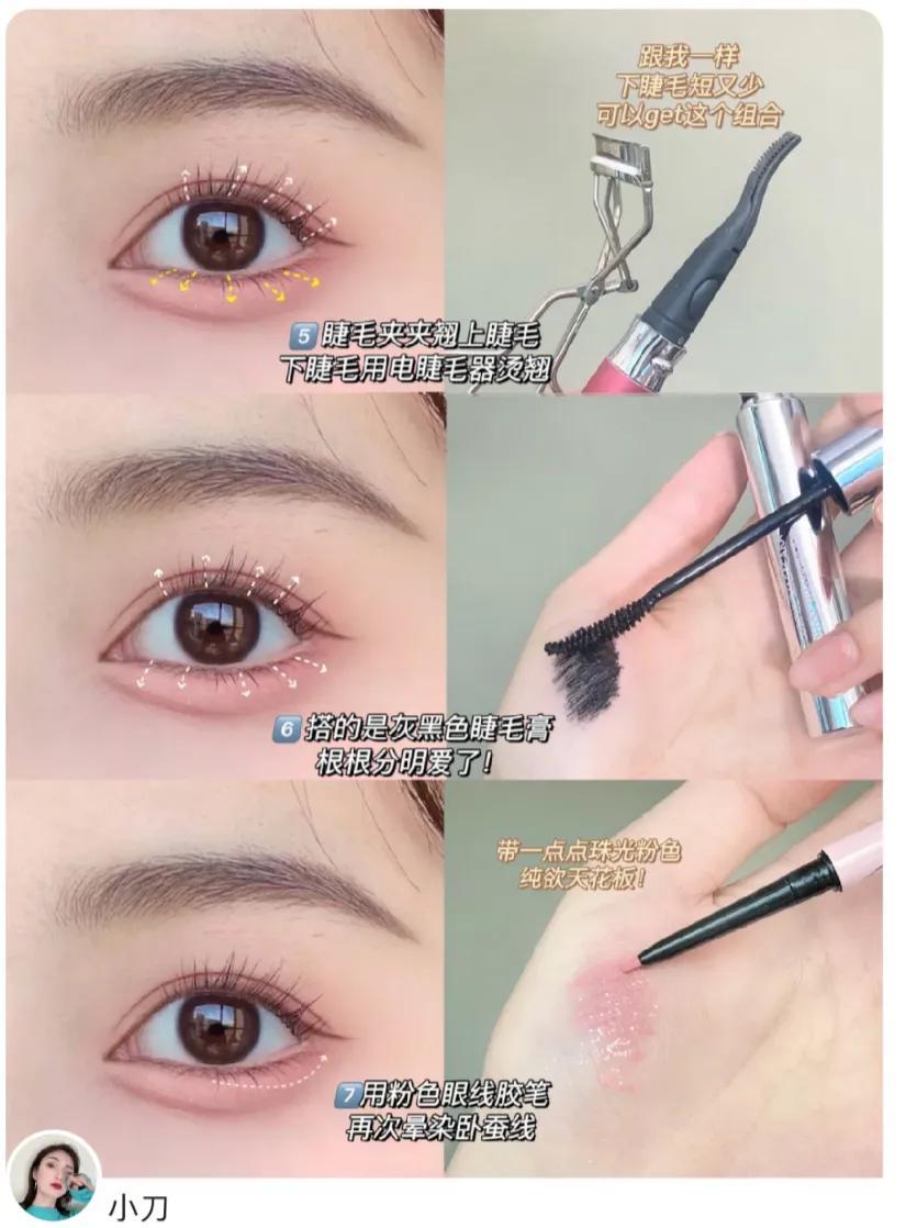 這款妝容的不同之處,就是使用粉色的眼線膠筆來畫臥蠶。