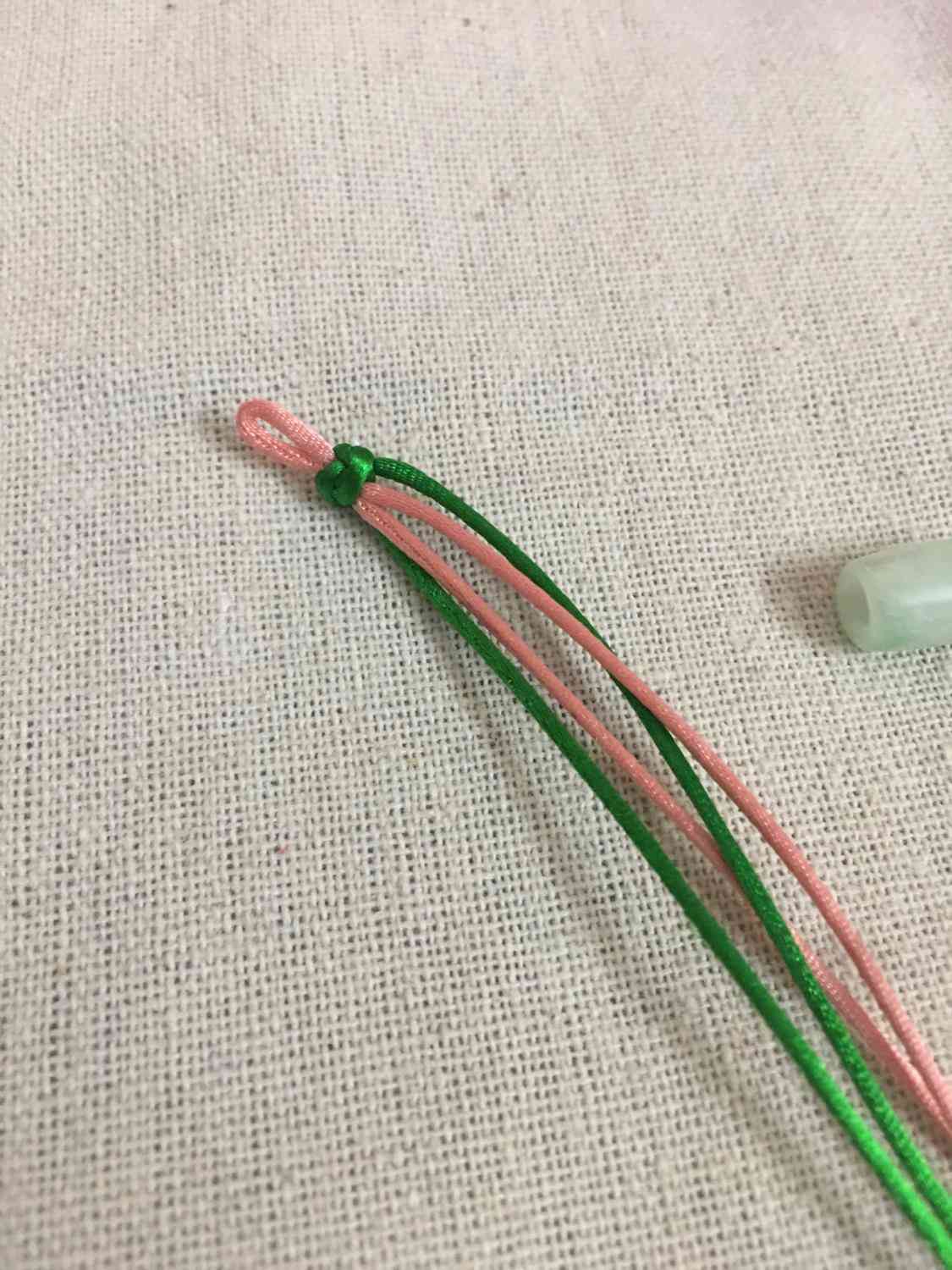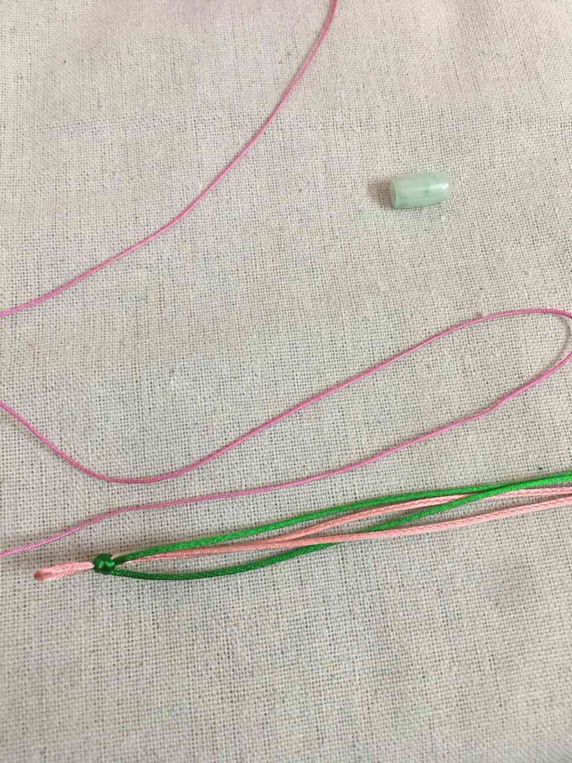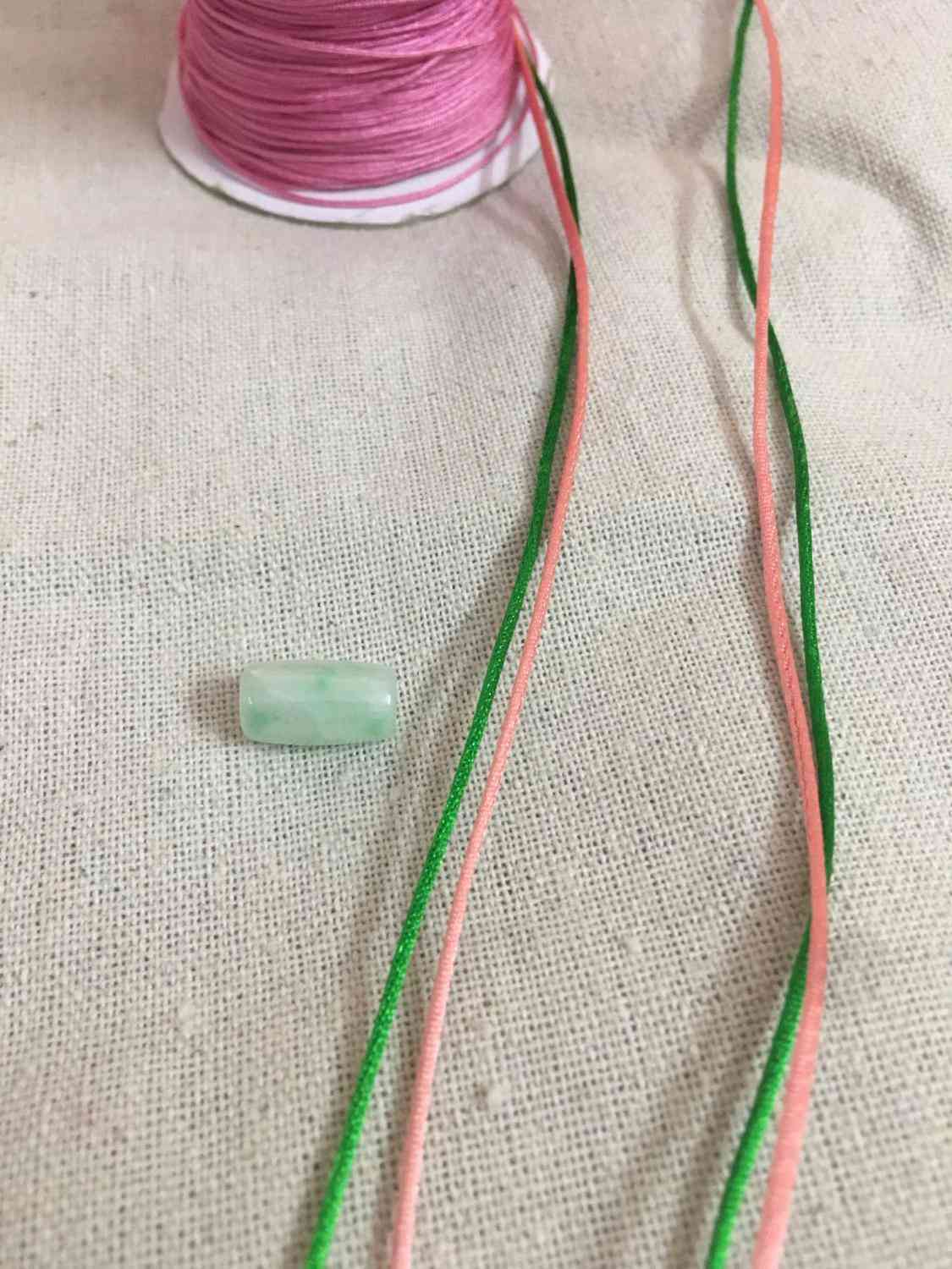 準(zhǔn)備兩條長度為80厘米的中國結(jié)線。一段長度60厘米的粉色72號玉線,當(dāng)然還有一個(gè)翡翠路路通。