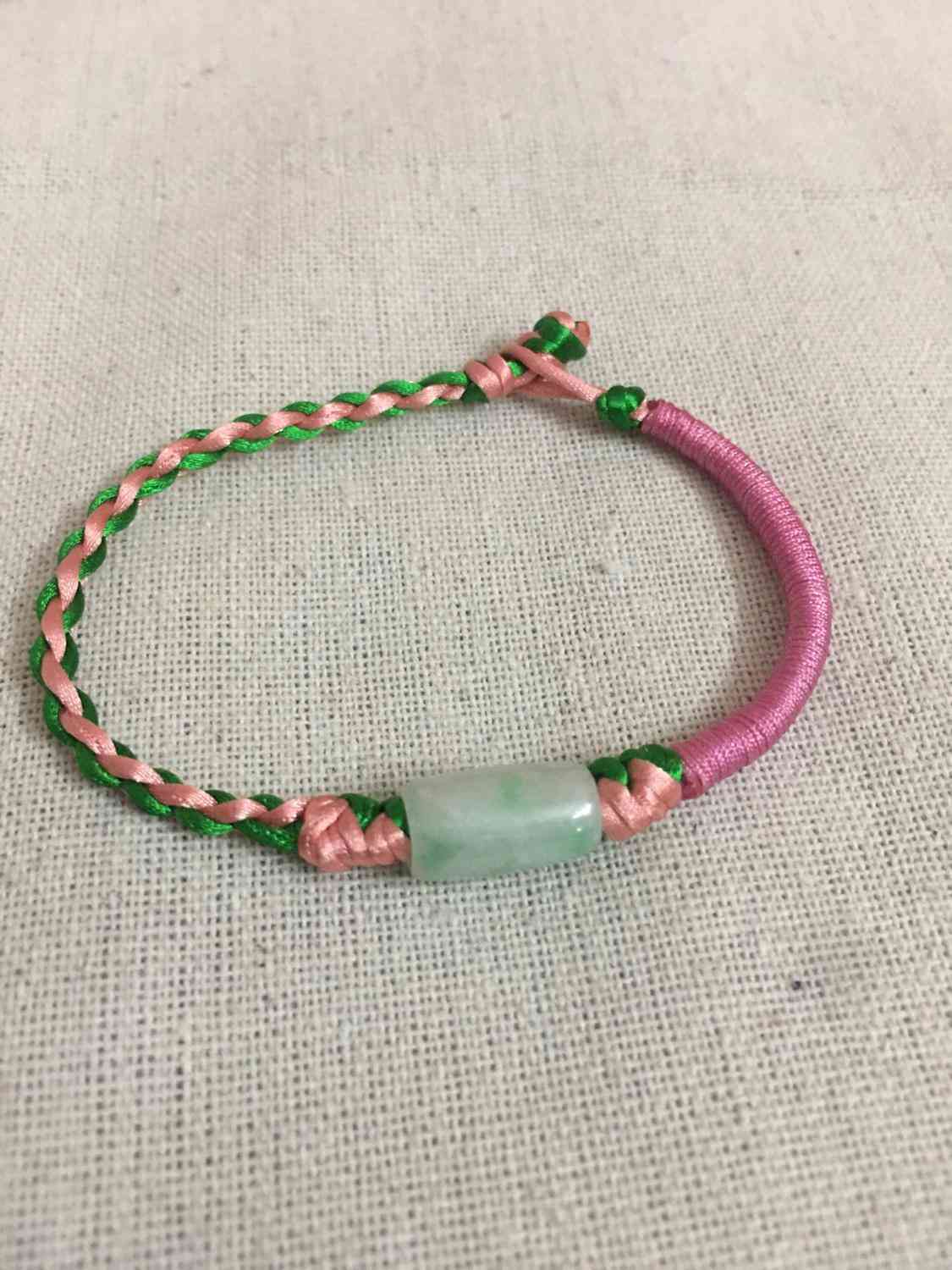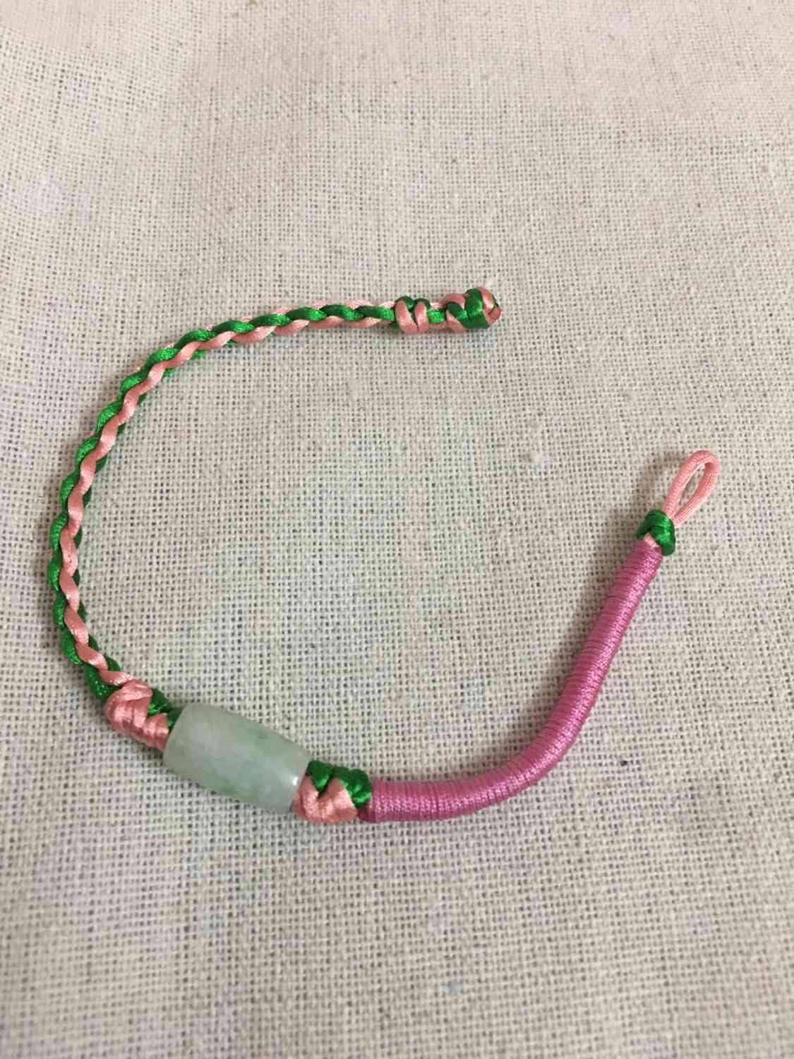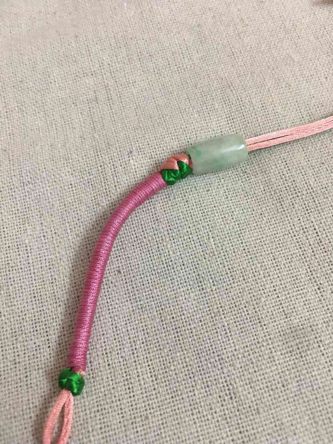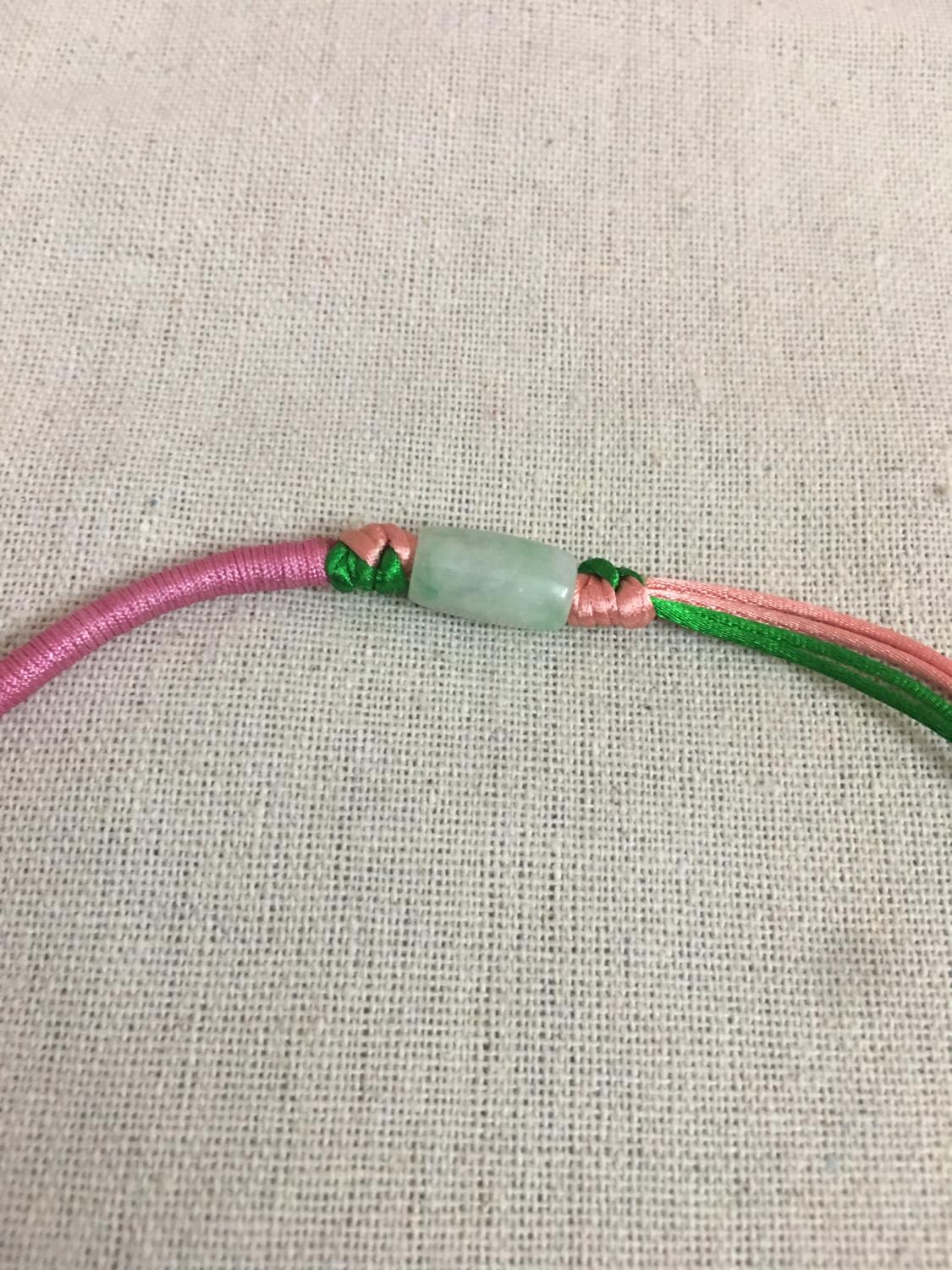 準(zhǔn)備兩條長度為80厘米的中國結(jié)線。一段長度60厘米的粉色72號玉線,當(dāng)然還有一個(gè)翡翠路路通。
