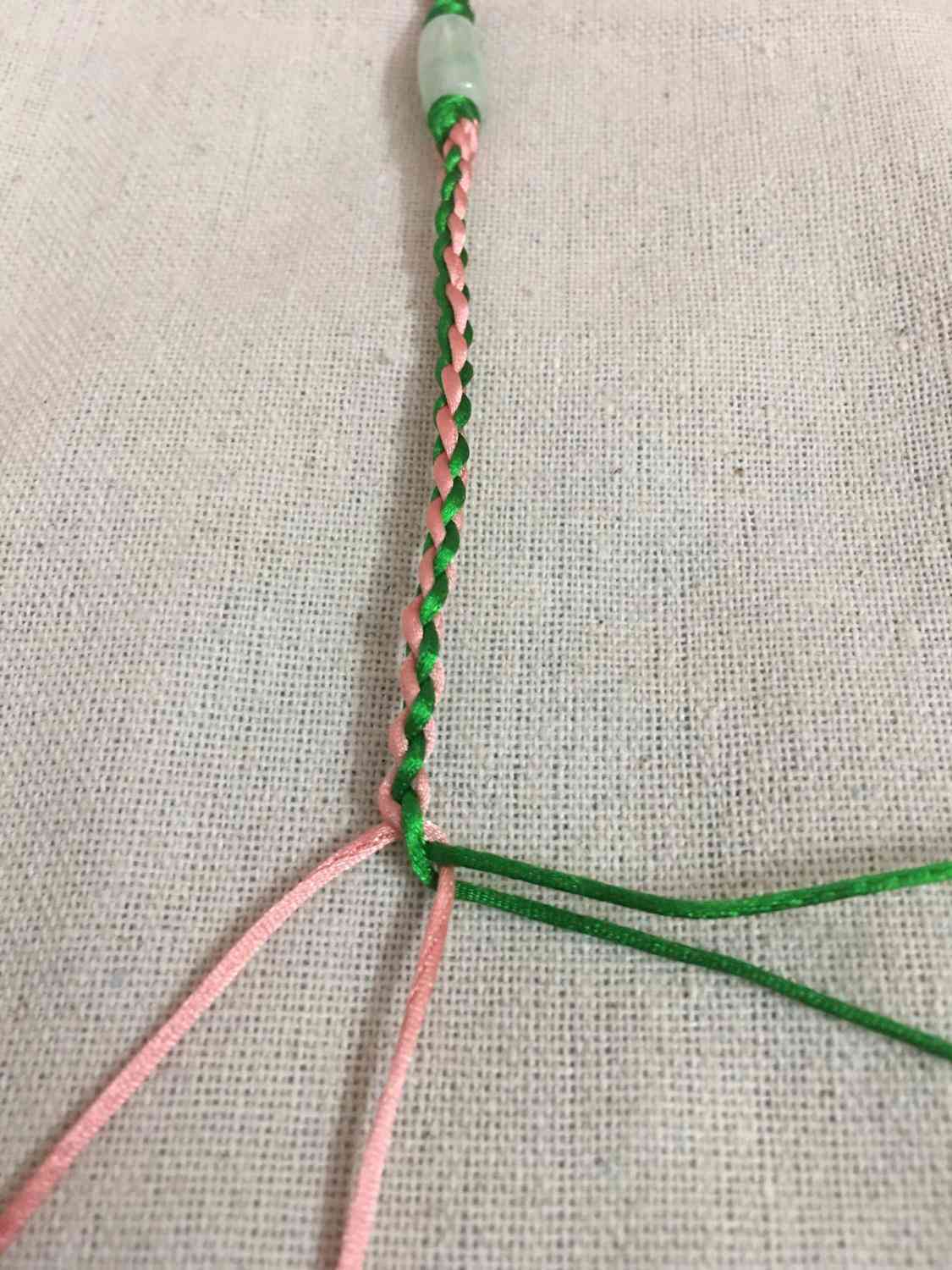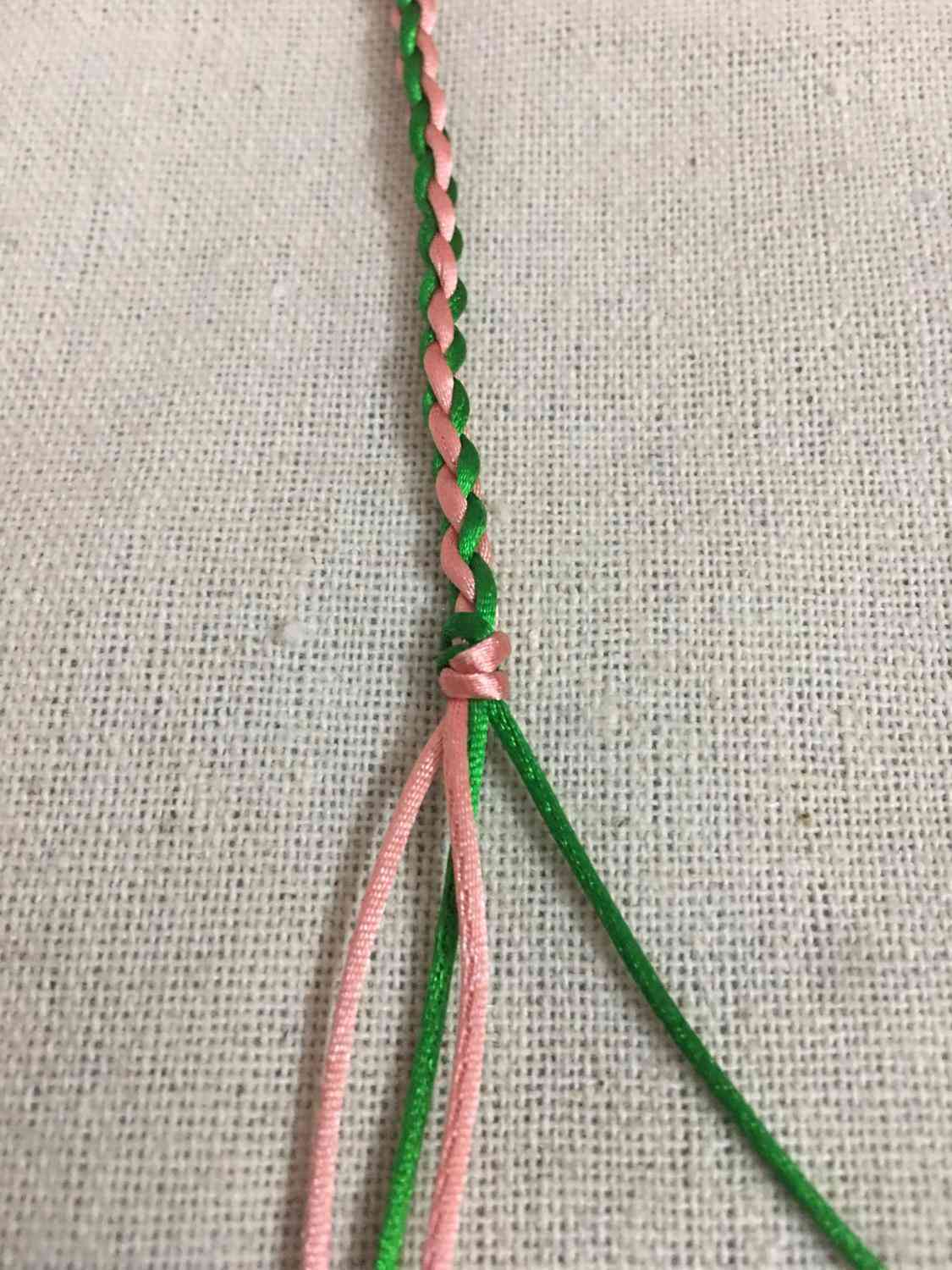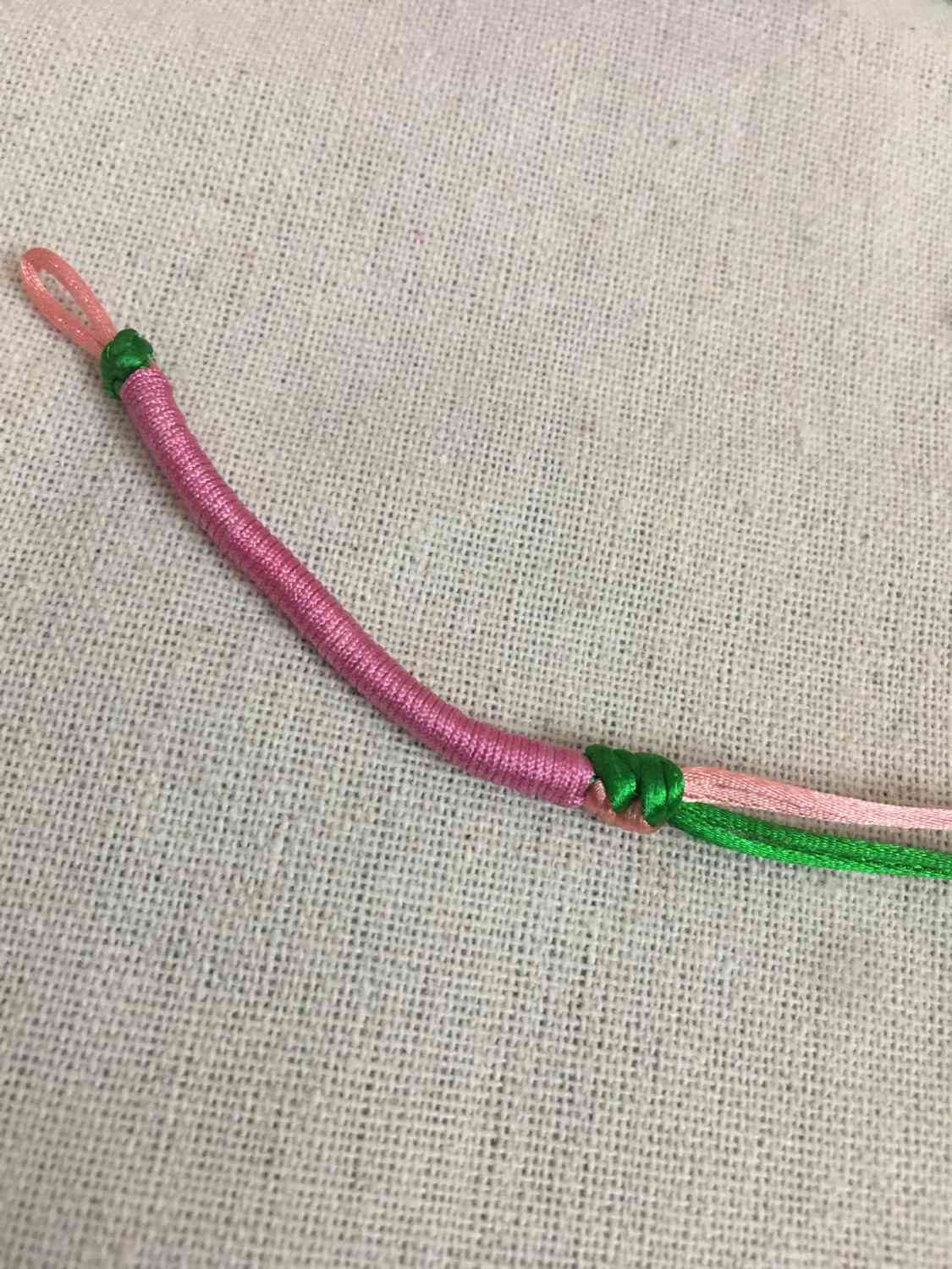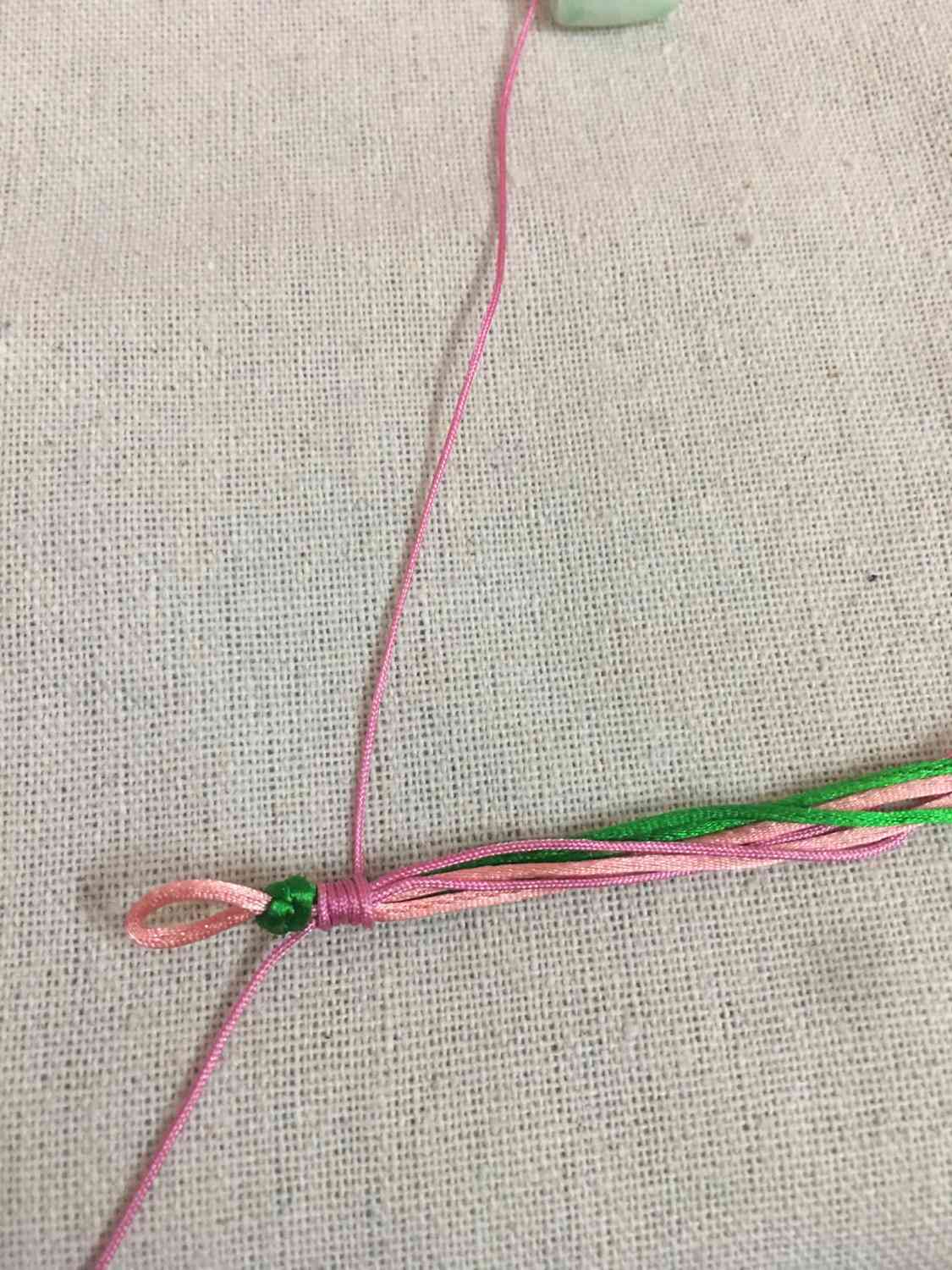 用粉色包住綠色線,編織兩個(gè)包線金剛結(jié)。這樣就可以把線地固定住,粉色線形成一個(gè)扣頭。