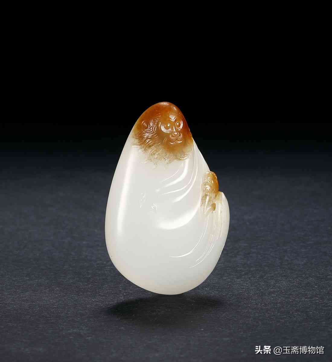 作品選用獨(dú)顆羊脂玉雕琢而成,質(zhì)若凝脂,潤(rùn)如羊脂。作者巧用俏色雕琢母子靈猴頭部,小靈猴由仙石迸出,寫意化表現(xiàn)身體。母猴慈祥小猴活潑可愛,充滿好奇的神態(tài),大有孫悟空橫空出世,桀驁不馴之氣勢(shì)。
