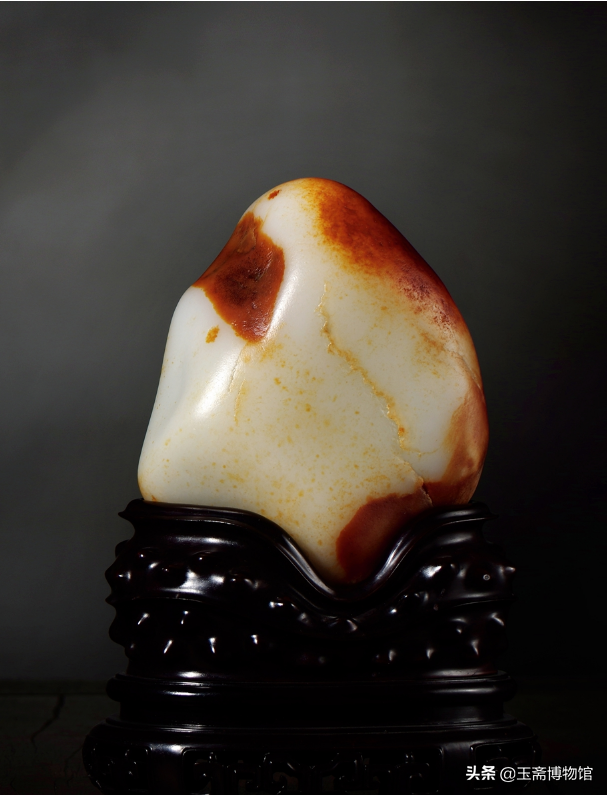 這件作品所選用的材質(zhì)是新疆和田玉籽料,棗紅色玉皮色澤鮮艷,玉質(zhì)結(jié)構(gòu)致密,細(xì)膩均勻,無綹無裂,潔凈無瑕,白度亦佳,油潤(rùn)度尤好,呈現(xiàn)出如凝煉的油脂般的光澤與潤(rùn)度,從其白度、結(jié)構(gòu)、油性等方面來看,此件玉作的材質(zhì)在品質(zhì)上達(dá)到了鮮有的羊脂級(jí)別,可以稱之為“羊脂玉”。