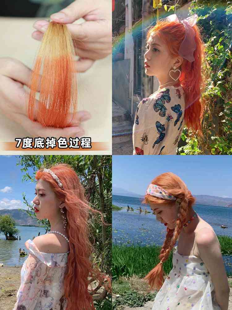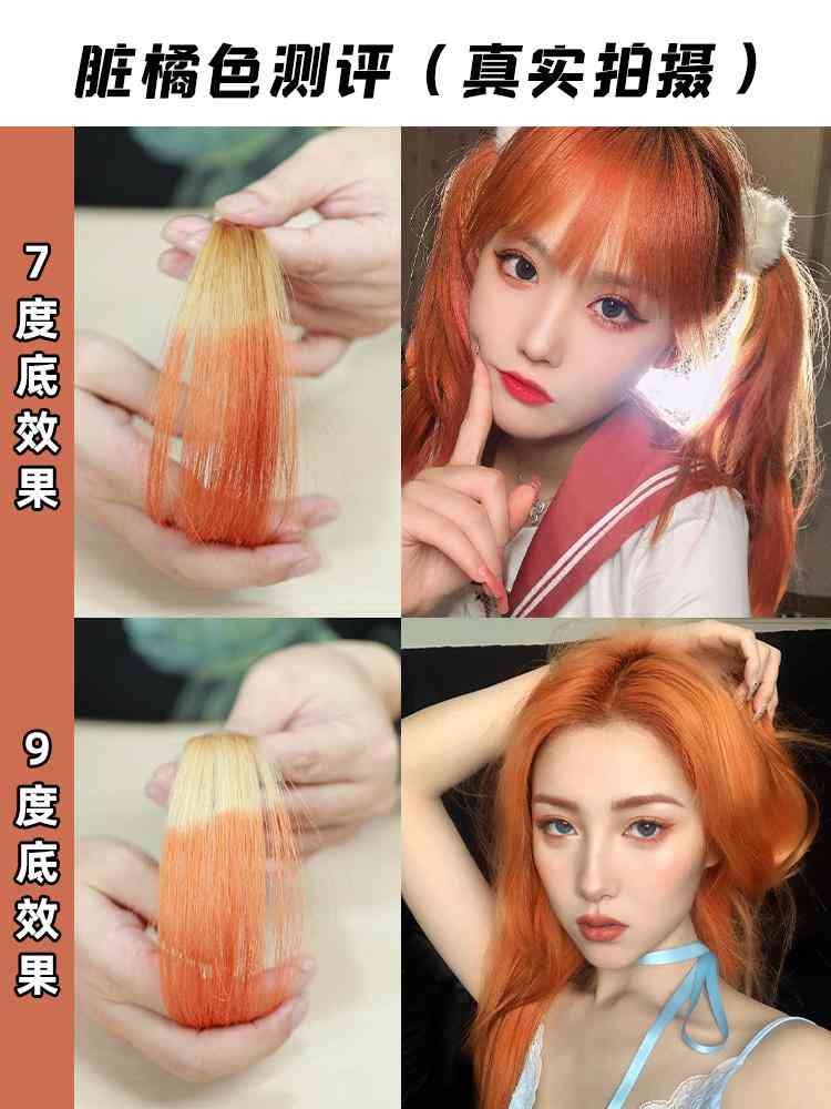 7度底染出來(lái)比5度底亮一點(diǎn)點(diǎn),染出來(lái)就是一個(gè)很標(biāo)準(zhǔn)的臟橘色啦~超級(jí)適合夏天,非常顯白,黃白皮都可入~但是稍微不適合黑皮,黑皮染了就跟頂著個(gè)黃色的電燈泡更黑了點(diǎn)!