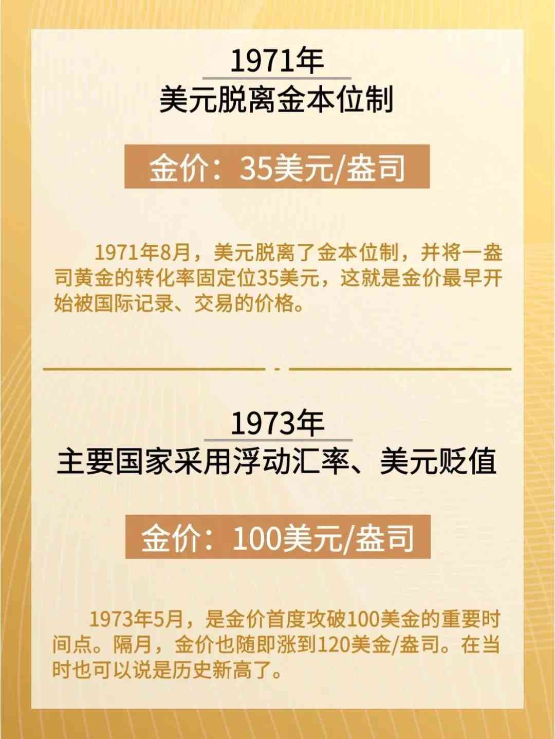 1971年8月,美元脫離了金本位制,并將一盎司黃金的轉(zhuǎn)化率固定位35美元,這是金價(jià)最早開(kāi)始被國(guó)際記錄、交易的價(jià)格。