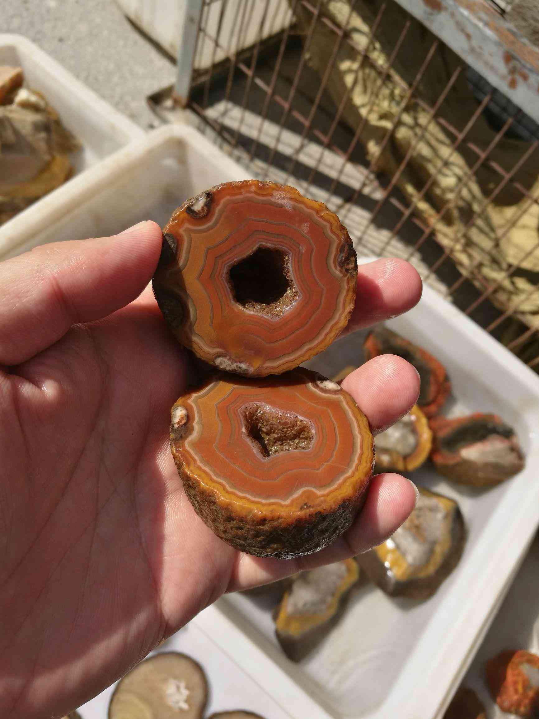 這些都是天然的瑪瑙石材,切開以后就是下面這個圖的樣子,中間的鏤空是天然的,很神奇。這樣的顏色都是天然形成,在現(xiàn)在叫做戰(zhàn)國紅。這塊石頭是河北宣化的,一對能賣到150塊。