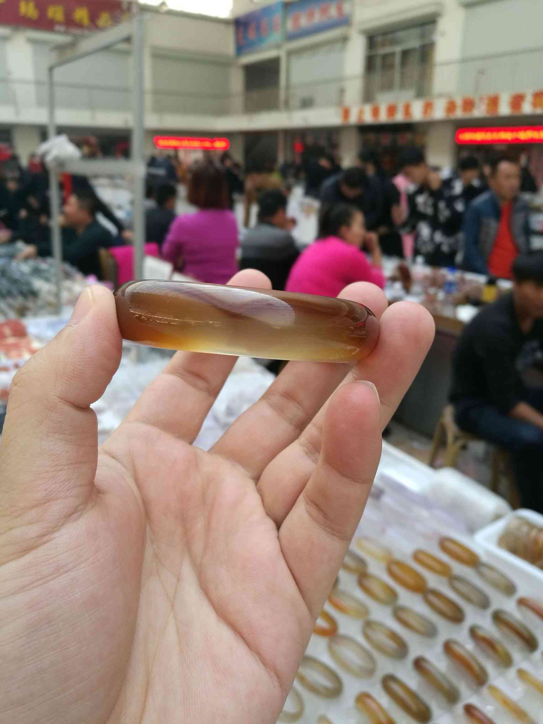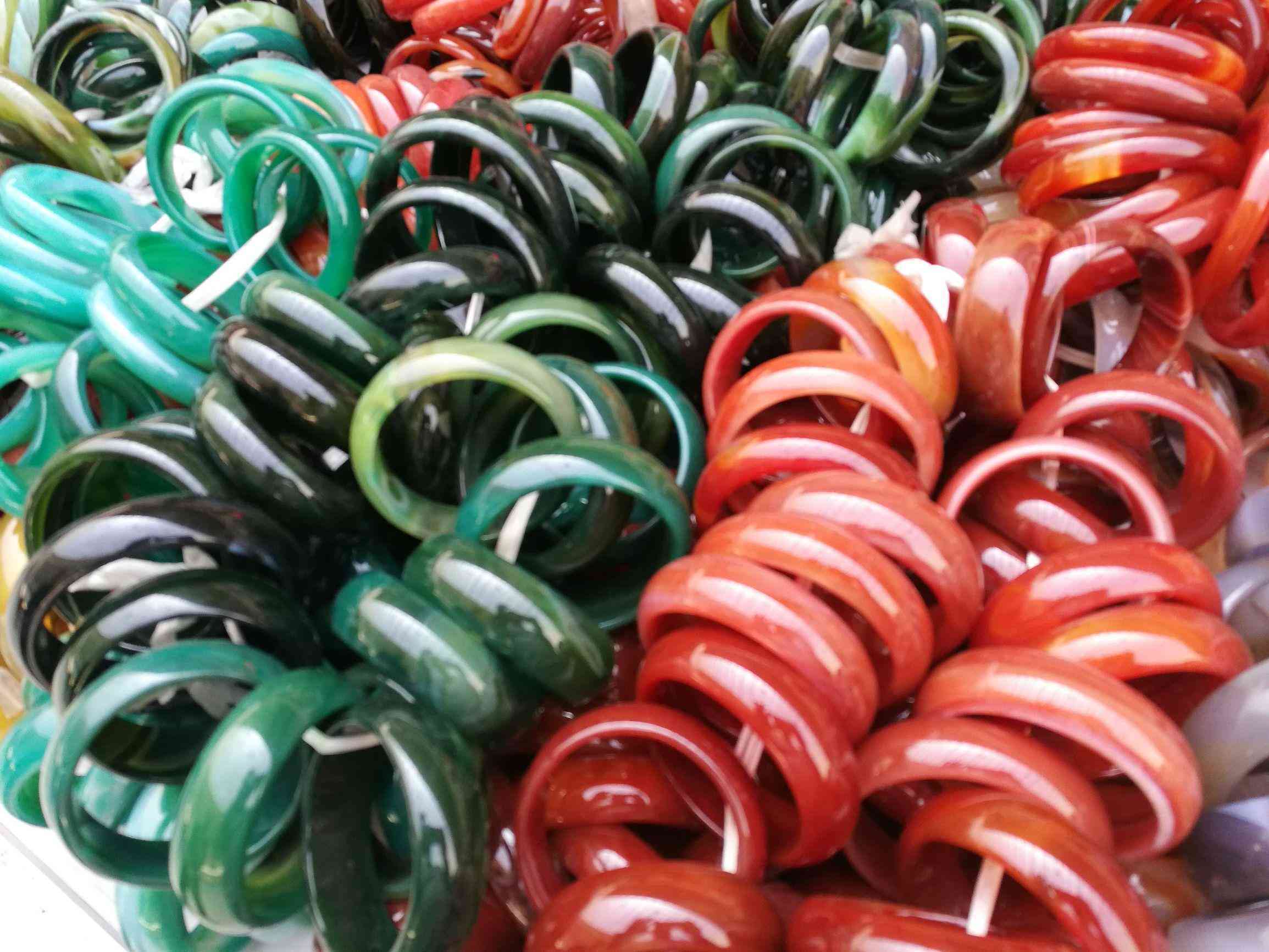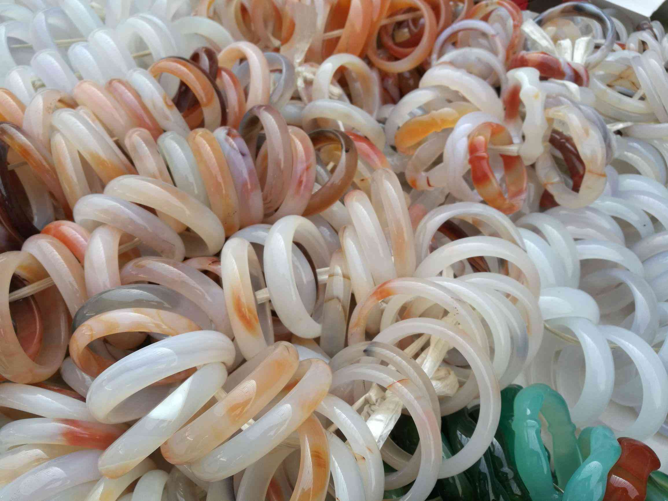 這樣的是天然瑪瑙石制作的手鐲,顏色通透,在十家子批發(fā)的價格在50元左右。