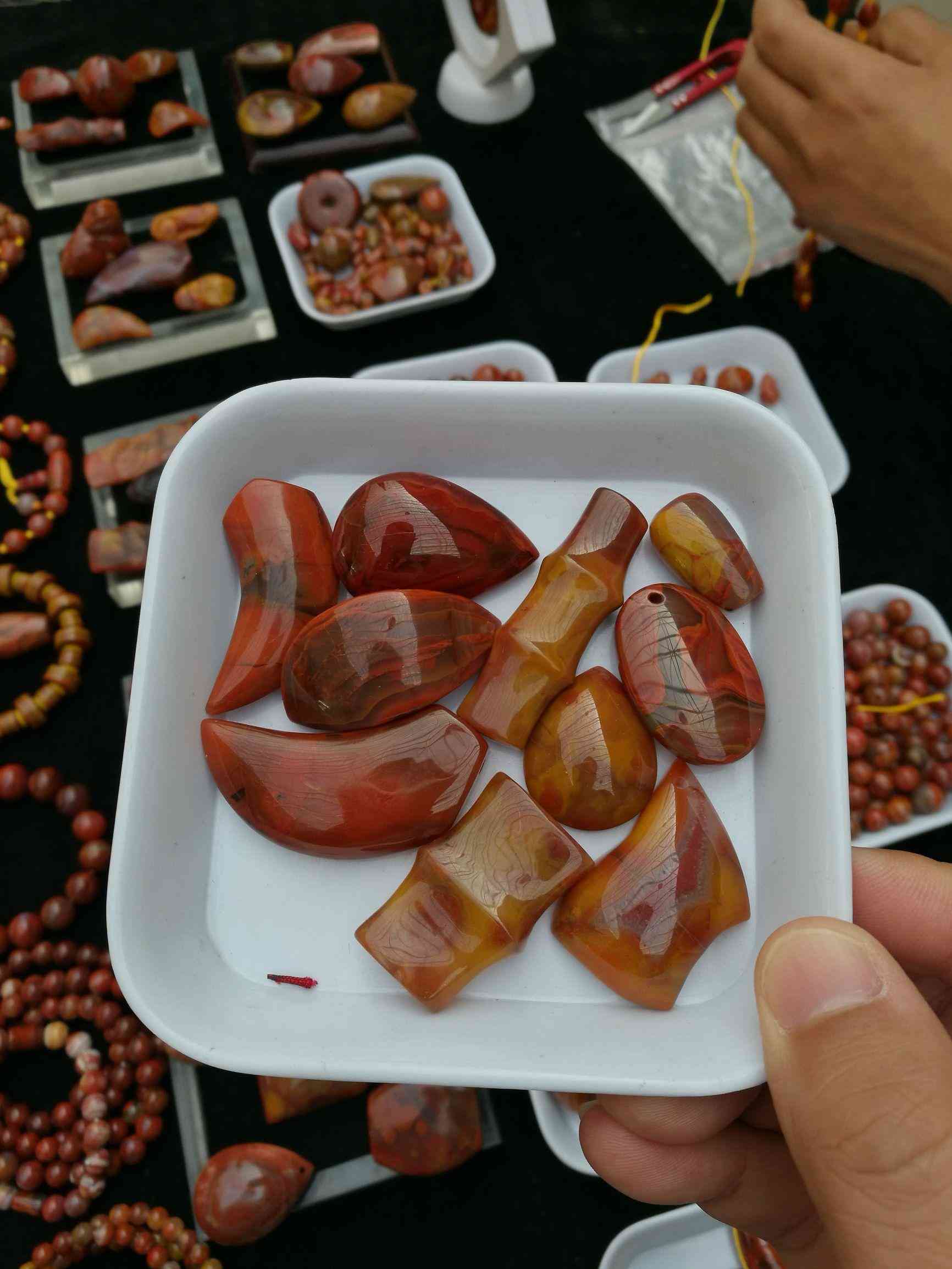 上圖這個盤子里的石頭,150元一個,是最便宜的戰(zhàn)國紅系列。