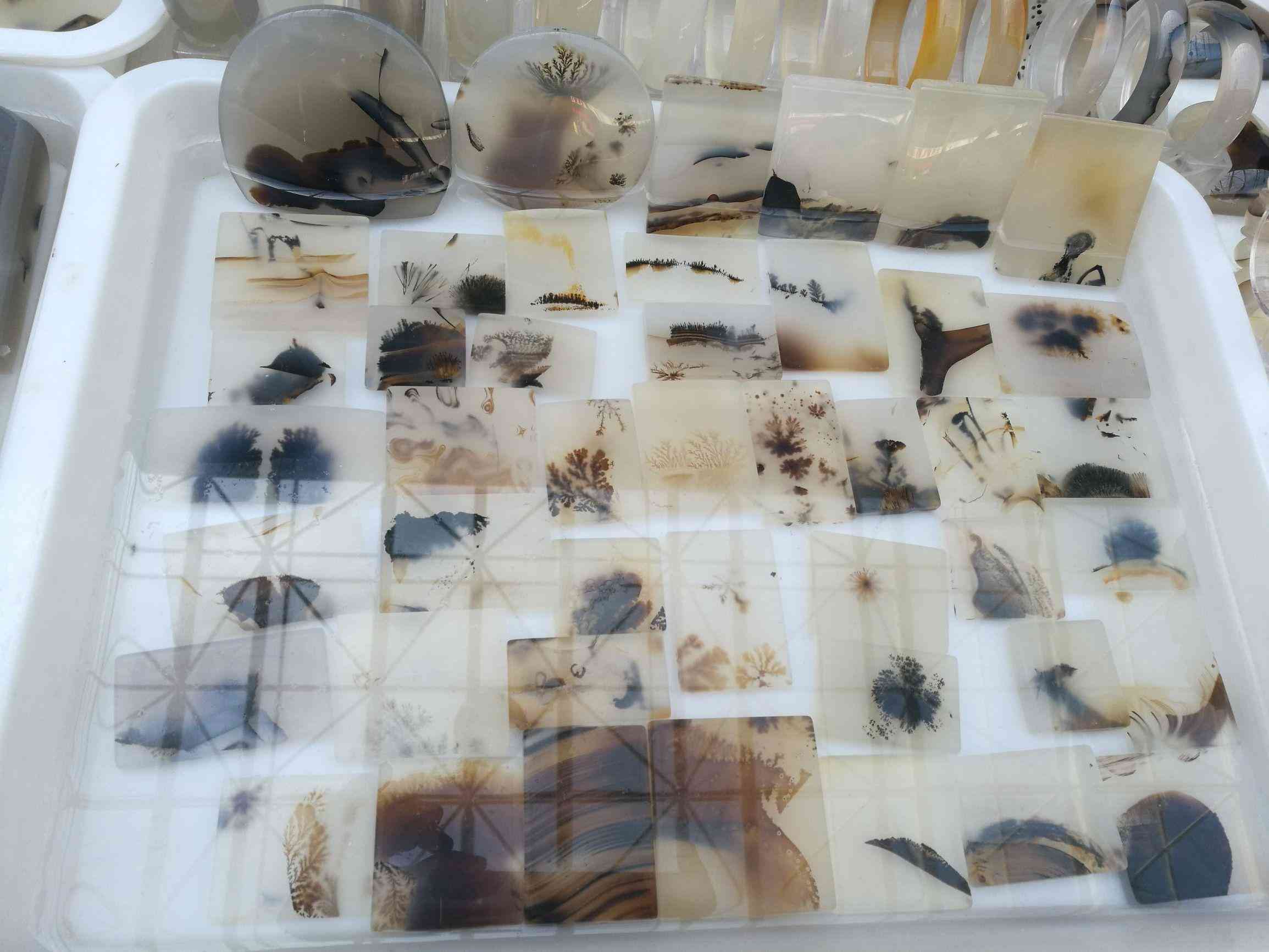 大市場外面就是這些賣原材料的,這是產(chǎn)業(yè)的上游環(huán)節(jié)。每一個十家子的瑪瑙經(jīng)營者都是一個創(chuàng)意大師,他們會根據(jù)開出來的圖案設(shè)計一個故事,來設(shè)計基礎(chǔ)圖案下的形狀。如果沒有好的圖案,就切片后做成手鐲、麻將、手串。