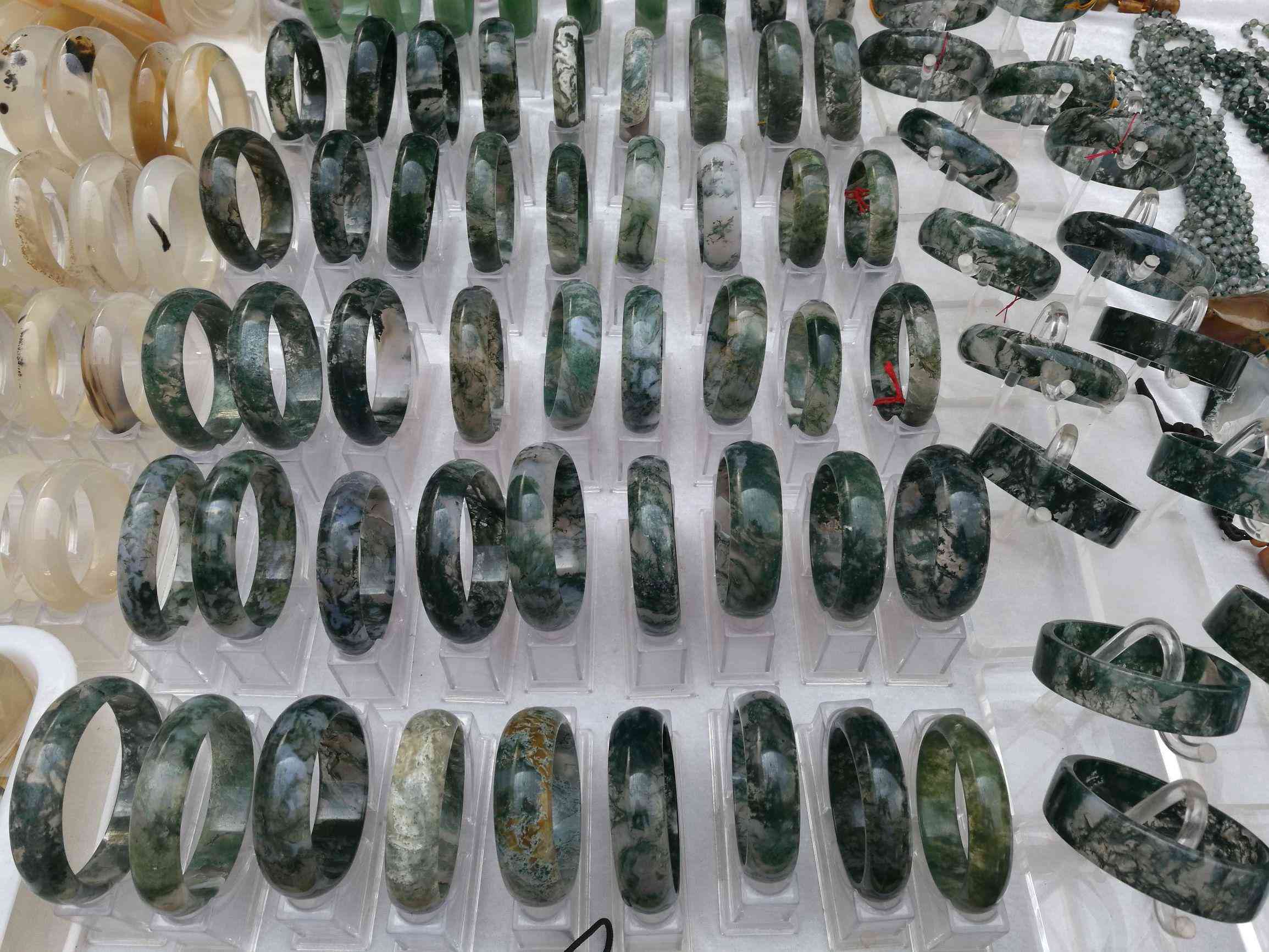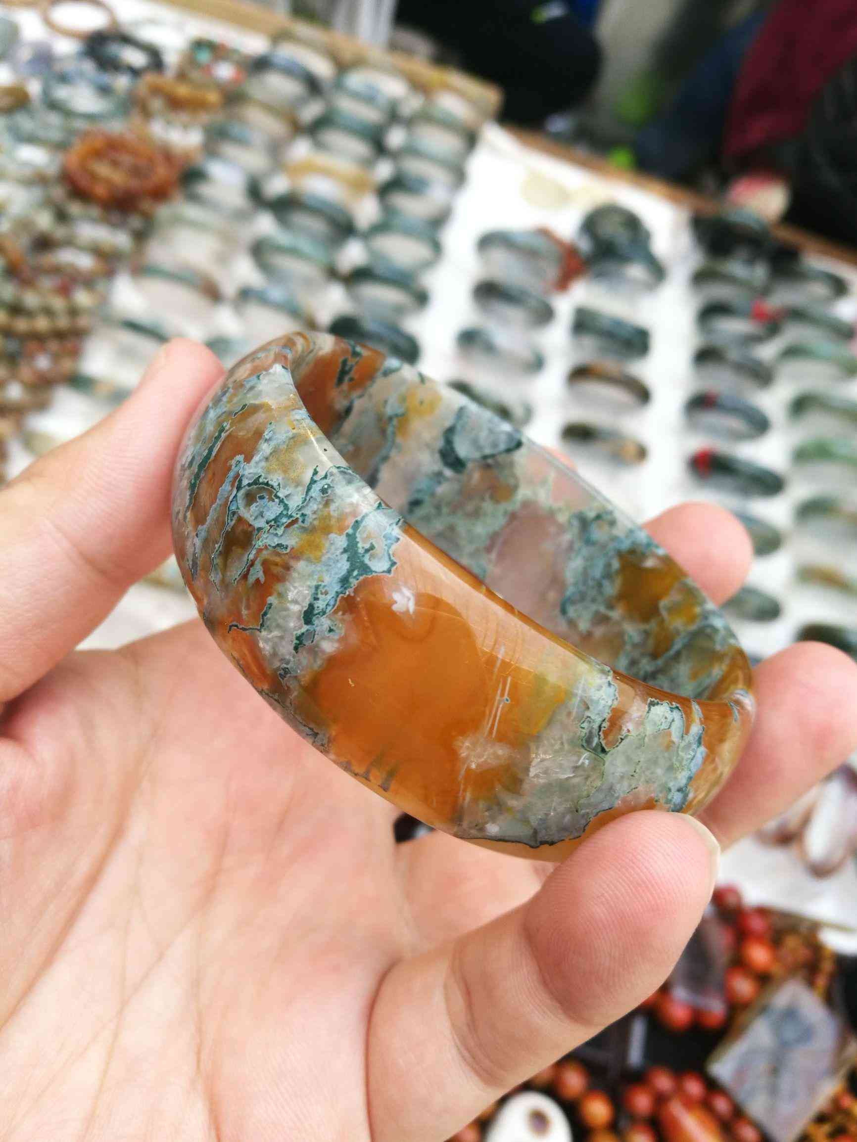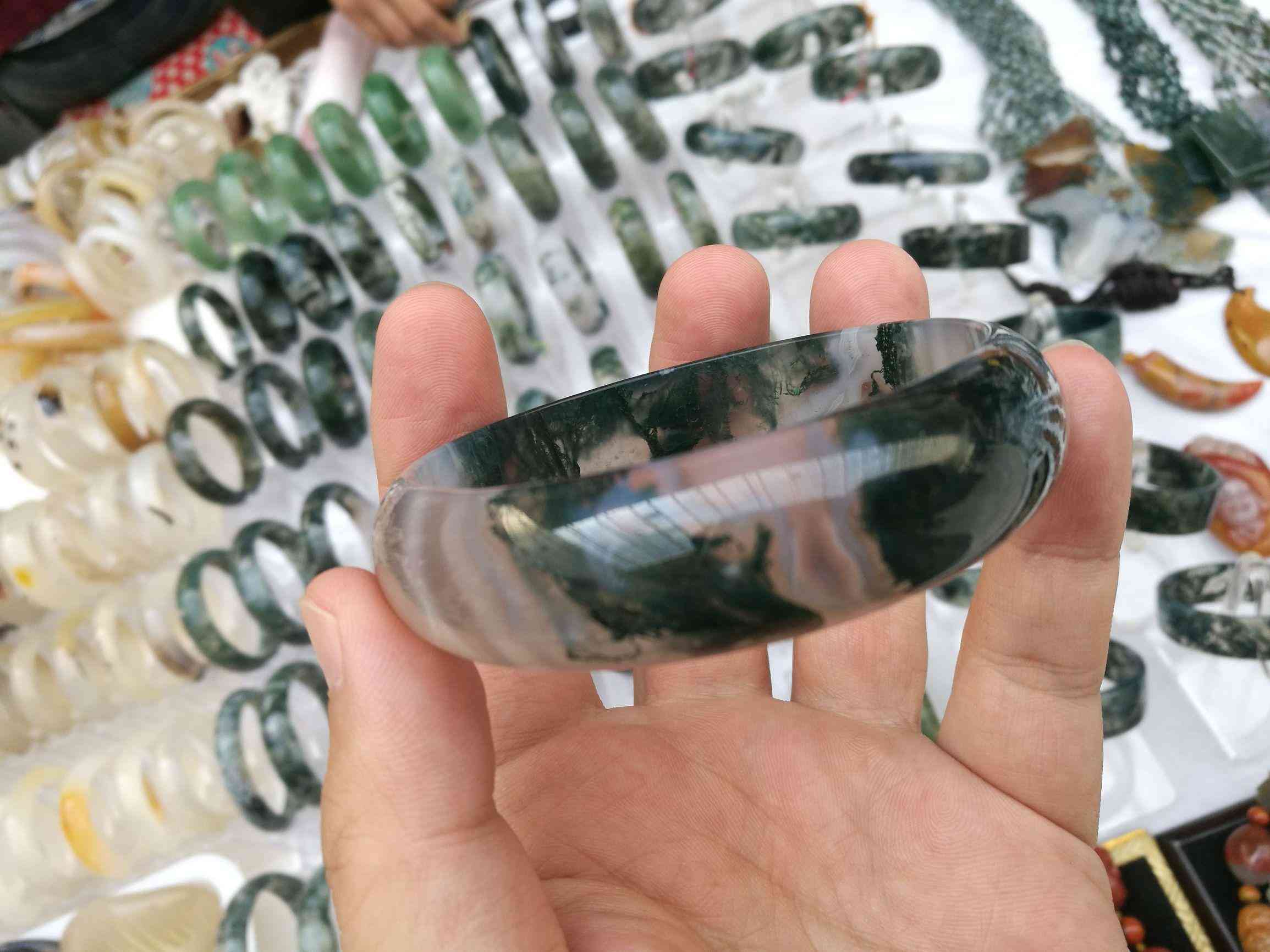 這樣的石材來自印度,阜新本地也有。這樣的手鐲大概100-200 一個,水草手鐲。