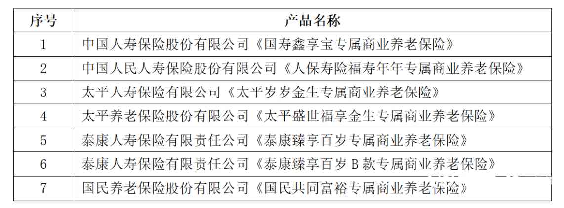 其中主要包括:國壽鑫享寶,人保壽險(xiǎn)福壽年年、太平人壽歲歲金生、太平盛世福享金生、泰康臻享百歲、泰康臻享百歲B款和國民共同富裕7款專屬商業(yè)養(yǎng)老保險(xiǎn),分別來自于4家人身險(xiǎn)公司和2家養(yǎng)老險(xiǎn)公司。