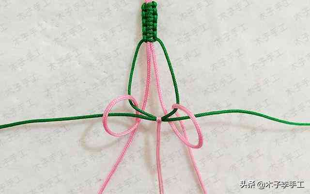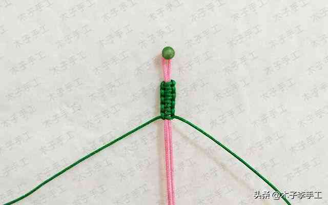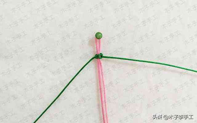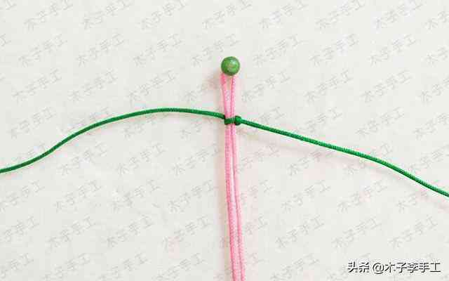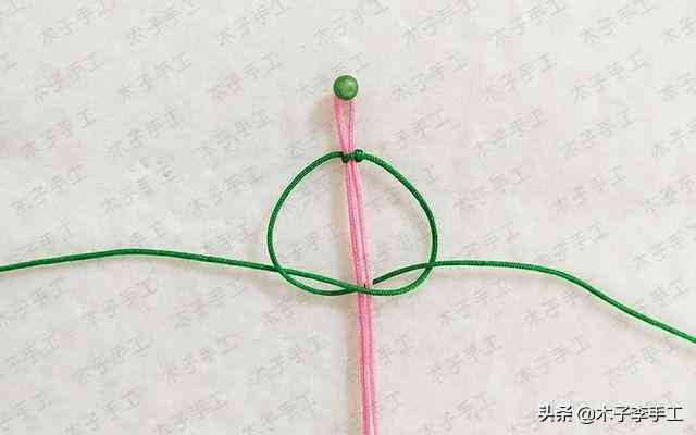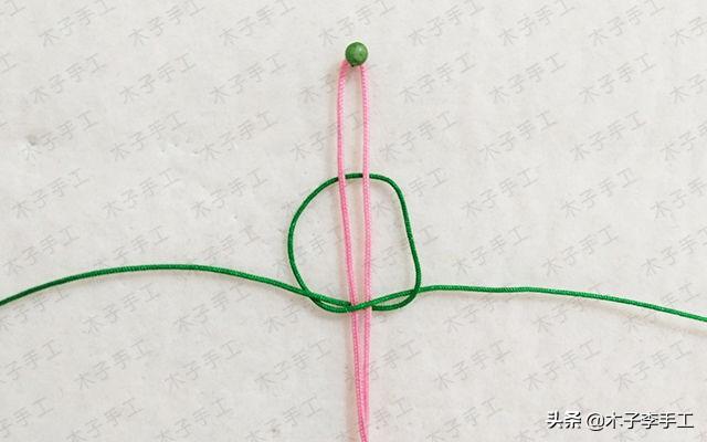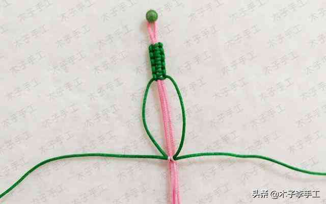 6、兩根綠色的線交叉,一根100cm的粉紅色71號(hào)玉線對(duì)折后在綠色線上做雀頭結(jié)掛住
